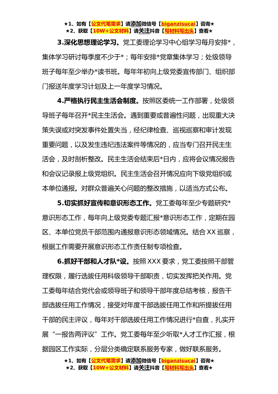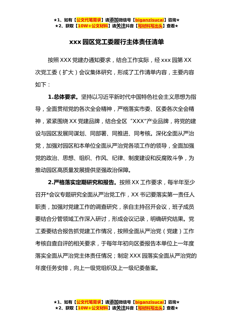 ★1、如有【公文代笔需求】请添加微信号【biganzisucai】咨询★★2、获取【10W+公文材料】请关注抖音【写材料写出头】查看★xxx园区党工委履行主体责任清单按照XXX党建办通知要求,结合工作实际,经xxx园第XX次党工委(扩大)会议集体研究,形成了工作清单内容,主要内容如下:1.总体要求。坚持以习近平新时代中国特色社会主义思想为指导,全面贯彻党的各次全会精神,严格落实市委、区委各次全会精神,紧紧围绕XX党建品牌,结合全区“XXX”产业品牌,将党的建设与园区发展同谋划、同部署、同推进、同考核。深化全面从严治党,加强对园区和本单位全面从严治党各项工作的领导,全面加强党的政治、思想、组织、作风、纪律、制度建设和反腐败斗争,为推动园区高质量发展提供坚强政治保障。2.严格落实定期研究和报告。...