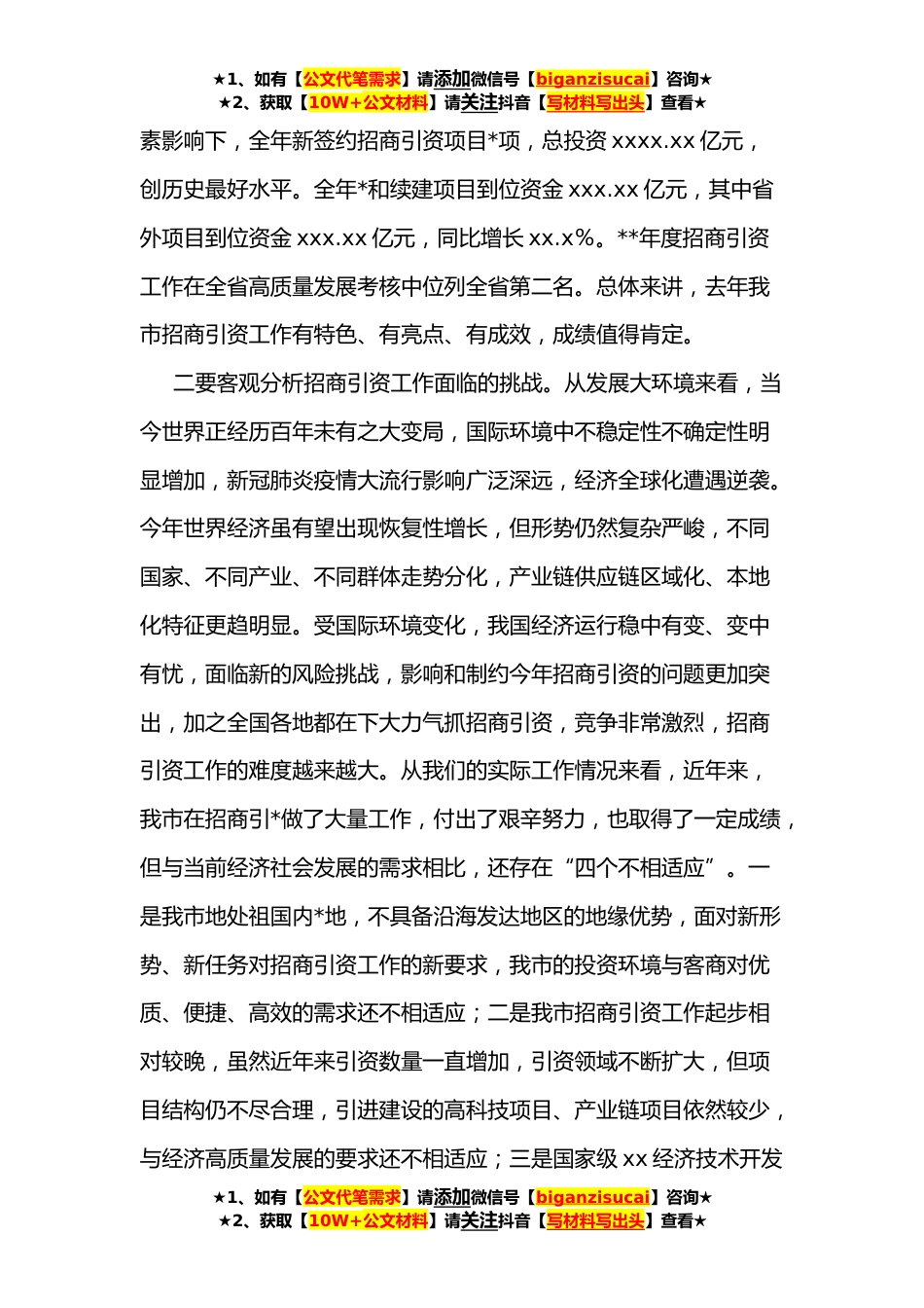 ★1、如有【公文代笔需求】请添加微信号【biganzisucai】咨询★★2、获取【10W+公文材料】请关注抖音【写材料写出头】查看★在全市招商引资工作会议上的讲话同志们:今天,我们召开全市招商引资工作会议,主要任务是贯彻落实市委x次全会、市政府第x次全体会议精神,总结**年全市招商引资工作,对标查找问题和不足,安排部署今年重点任务。前面,表彰奖励了**年度招商引资工作先进集体和先进个人,下达了**招商引资工作计划。xx同志作了工作报告,在回顾总结去年招商引资工作的基础上,对今年的重点工作作了安排部署,讲的很具体、很到位,我完全同意,请大家认真抓好落实。下面,我讲四个方面的意见。一、科学研判形势,增强抓好招商引资工作的责任担当长期以来,招商引资一直是发展地方经济的重要手段,也是县域...