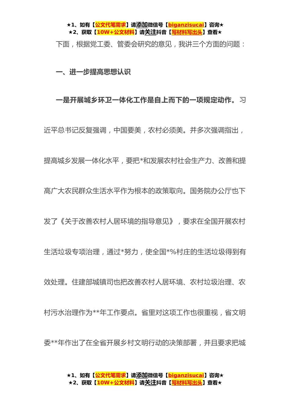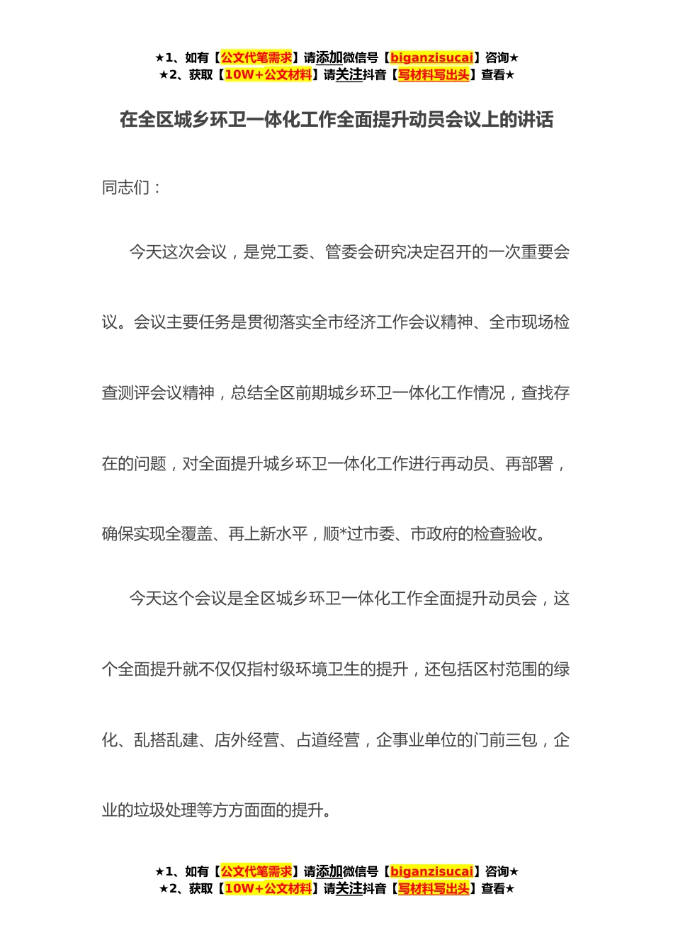 ★1、如有【公文代笔需求】请添加微信号【biganzisucai】咨询★★2、获取【10W+公文材料】请关注抖音【写材料写出头】查看★在全区城乡环卫一体化工作全面提升动员会议上的讲话同志们:今天这次会议,是党工委、管委会研究决定召开的一次重要会议。会议主要任务是贯彻落实全市经济工作会议精神、全市现场检查测评会议精神,总结全区前期城乡环卫一体化工作情况,查找存在的问题,对全面提升城乡环卫一体化工作进行再动员、再部署,确保实现全覆盖、再上新水平,顺*过市委、市政府的检查验收。今天这个会议是全区城乡环卫一体化工作全面提升动员会,这个全面提升就不仅仅指村级环境卫生的提升,还包括区村范围的绿化、乱搭乱建、店外经营、占道经营,企事业单位的门前三包,企业的垃圾处理等方方面面的提升。★1、...