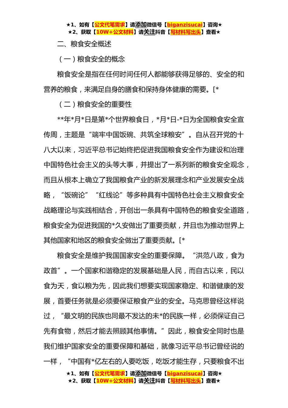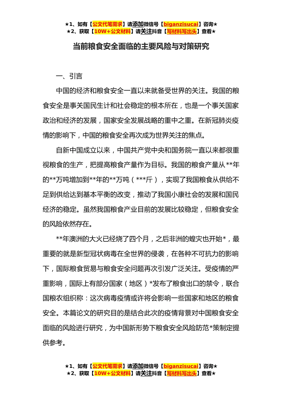 ★1、如有【公文代笔需求】请添加微信号【biganzisucai】咨询★★2、获取【10W+公文材料】请关注抖音【写材料写出头】查看★当前粮食安全面临的主要风险与对策研究一、引言中国的经济和粮食安全一直以来就备受世界的关注。我国的粮食安全是事关国民生计和社会稳定的根本所在,也是一个事关国家政治和经济的发展,国家安全发展战略的重中之重。在新冠肺炎疫情的影响下,中国的粮食安全再次成为世界关注的焦点。自新中国成立以来,中国共产党中央和国务院一直以来都很重视粮食的生产,把提高粮食产量作为目标。我国的粮食产量从**年的**万吨增加到**年的**万吨(***斤),实现了我国粮食从供给不足到供给达到基本平衡的改变,推动了我国小康社会的发展和国民经济的稳定。虽然我国粮食产业目前的发展比较稳定,但粮食...