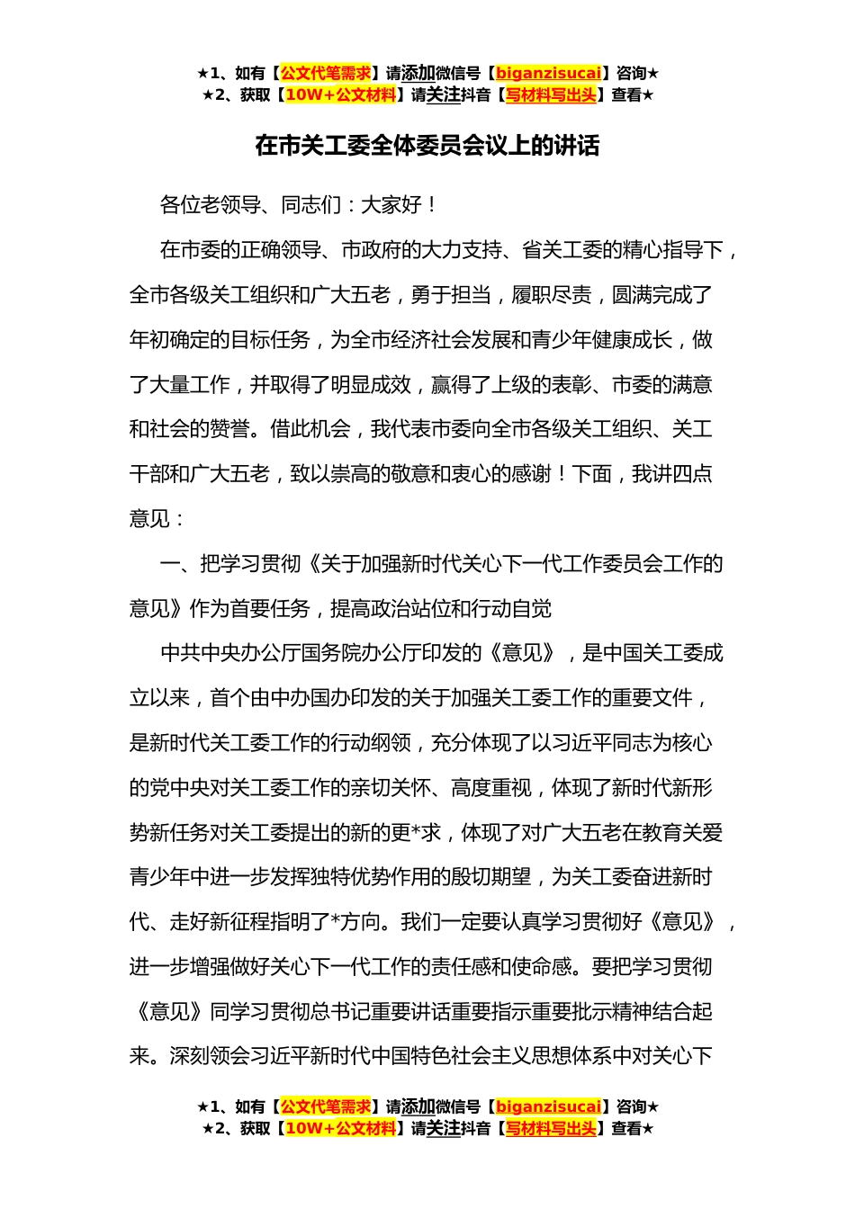 ★1、如有【公文代笔需求】请添加微信号【biganzisucai】咨询★★2、获取【10W+公文材料】请关注抖音【写材料写出头】查看★在市关工委全体委员会议上的讲话各位老领导、同志们:大家好!在市委的正确领导、市政府的大力支持、省关工委的精心指导下,全市各级关工组织和广大五老,勇于担当,履职尽责,圆满完成了年初确定的目标任务,为全市经济社会发展和青少年健康成长,做了大量工作,并取得了明显成效,赢得了上级的表彰、市委的满意和社会的赞誉。借此机会,我代表市委向全市各级关工组织、关工干部和广大五老,致以崇高的敬意和衷心的感谢!下面,我讲四点意见:一、把学习贯彻《关于加强新时代关心下一代工作委员会工作的意见》作为首要任务,提高政治站位和行动自觉中共中央办公厅国务院办公厅印发的《意...