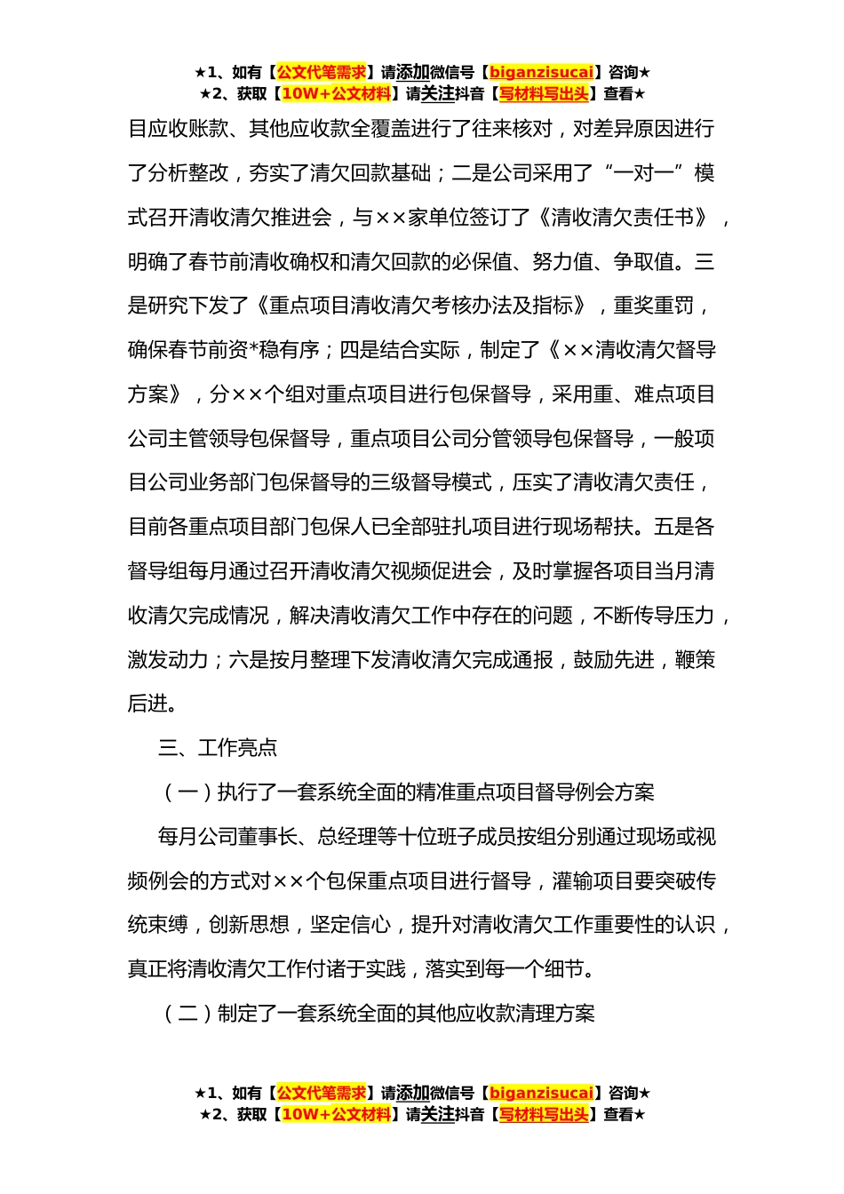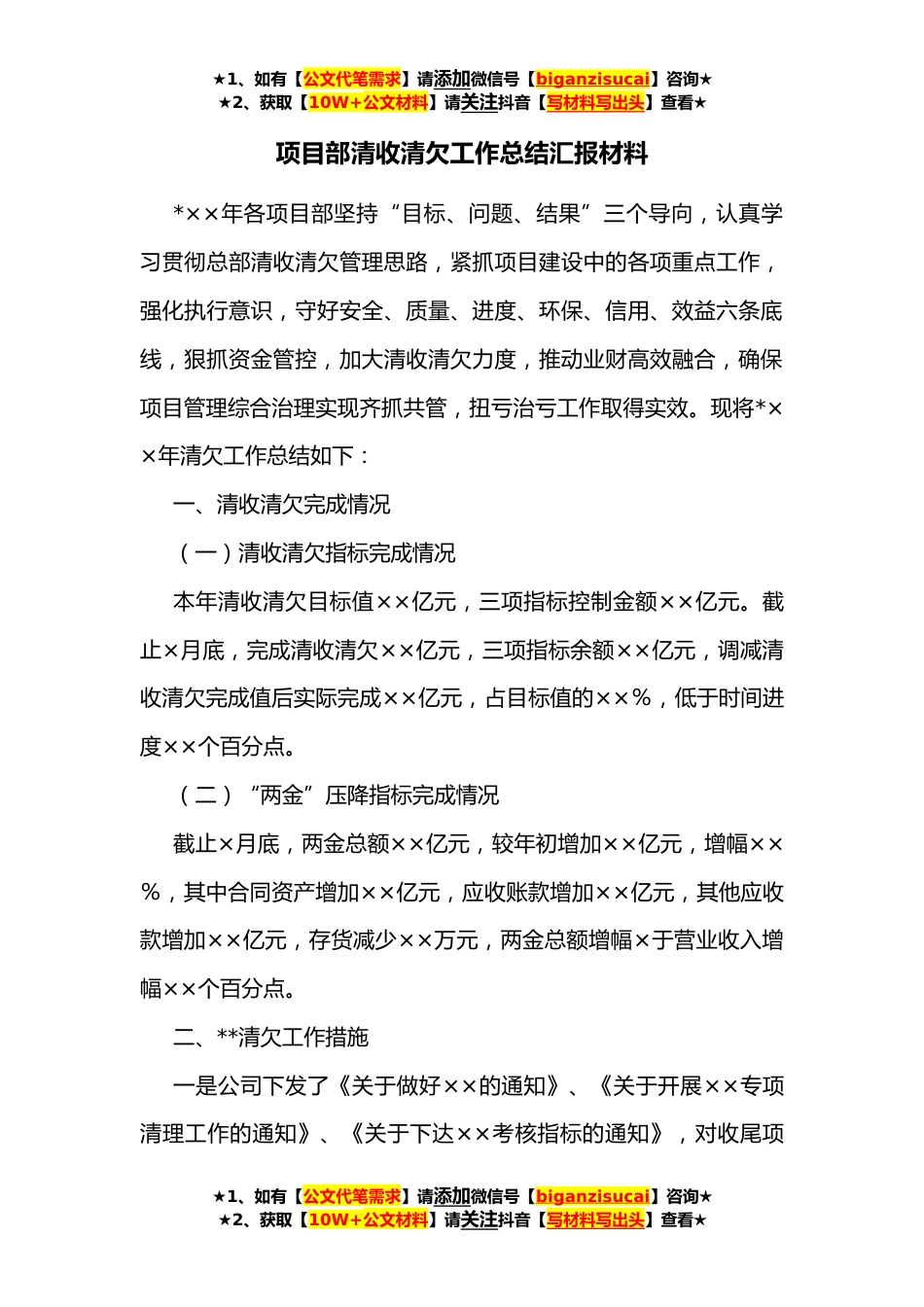 ★1、如有【公文代笔需求】请添加微信号【biganzisucai】咨询★★2、获取【10W+公文材料】请关注抖音【写材料写出头】查看★项目部清收清欠工作总结汇报材料*××年各项目部坚持“目标、问题、结果”三个导向,认真学习贯彻总部清收清欠管理思路,紧抓项目建设中的各项重点工作,强化执行意识,守好安全、质量、进度、环保、信用、效益六条底线,狠抓资金管控,加大清收清欠力度,推动业财高效融合,确保项目管理综合治理实现齐抓共管,扭亏治亏工作取得实效。现将*××年清欠工作总结如下:一、清收清欠完成情况(一)清收清欠指标完成情况本年清收清欠目标值××亿元,三项指标控制金额××亿元。截止×月底,完成清收清欠××亿元,三项指标余额××亿元,调减清收清欠完成值后实际完成××亿元,占目标值的×...