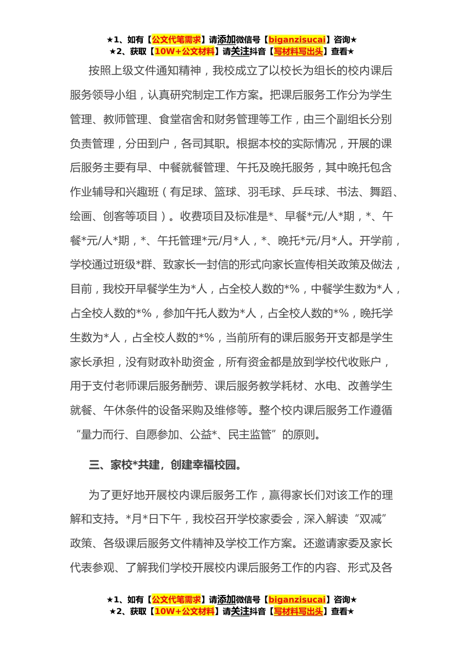 ★1、如有【公文代笔需求】请添加微信号【biganzisucai】咨询★★2、获取【10W+公文材料】请关注抖音【写材料写出头】查看★落实“双减”,幸福起航——区实验小学关于开展校内课后服务工作汇报根据《教育部办公厅关于做好中小学生课后服务工作的指导意见》、《**人民政府办公厅关于做好中小学生校内课后服务工作的指导意见》和*市教育局、*市*局、*市财政局、*市物价局关于印发《**小学生校内课后服务工作实施办法(试行)》的通知、关于推广部分地方义务教育课后服务有关创新举措和典型经验的通知精神。开展中小学生课后服务,是一项“顺民意、暖人心”的民生工程,是提高教育质量、促进学生全面健康成长的重要途径,是增强教育服务能力、有效减轻家长负担的重要举措。以及为了全面落实国家教育部“双减”政策,...