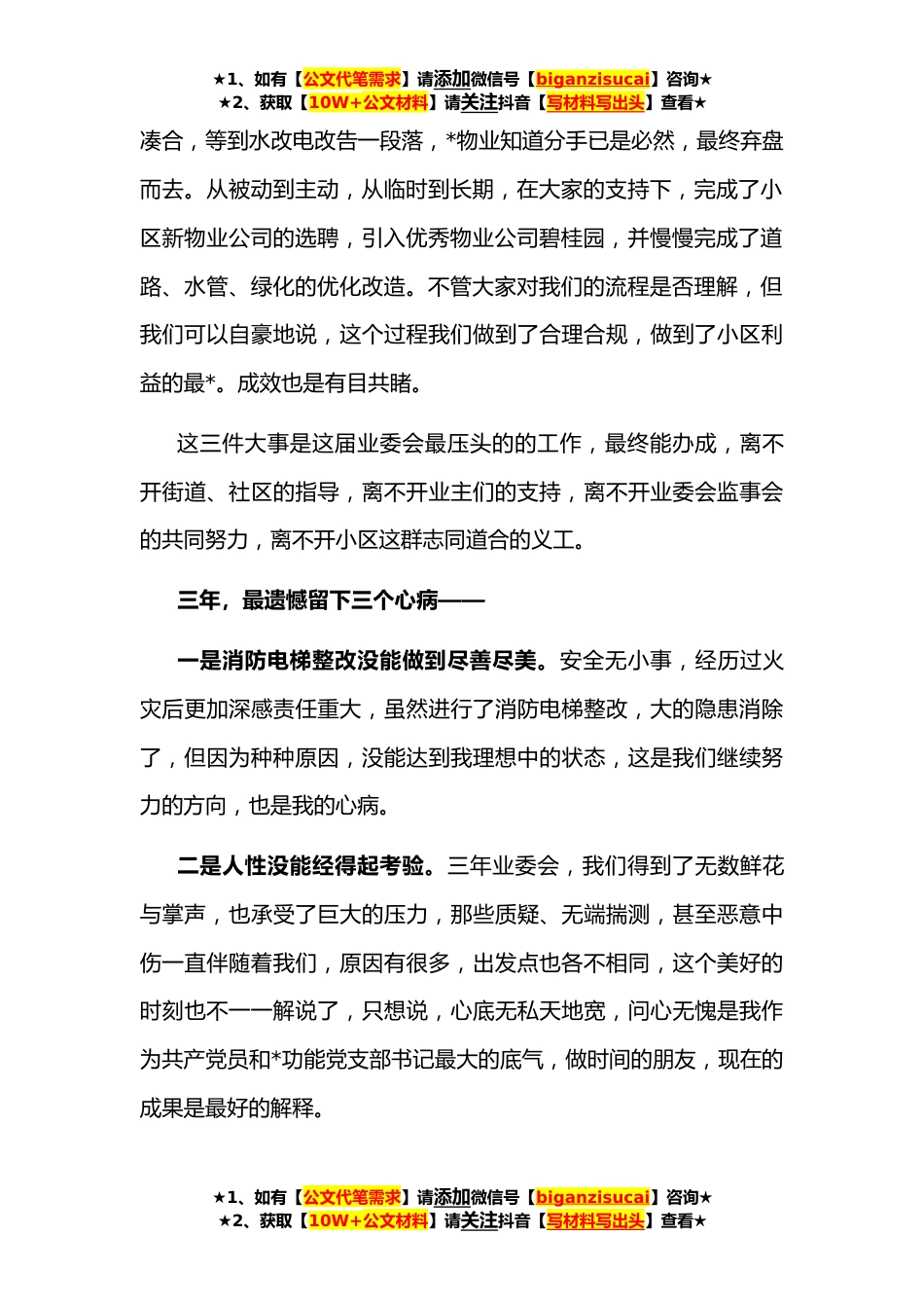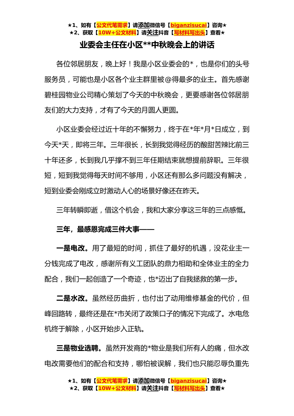 ★1、如有【公文代笔需求】请添加微信号【biganzisucai】咨询★★2、获取【10W+公文材料】请关注抖音【写材料写出头】查看★业委会主任在小区**中秋晚会上的讲话各位邻居朋友,晚上好!我是小区业委会的*,也是你们的头号服务员,可能也是小区各个业主群里被@得最多的业主。首先感谢碧桂园物业公司精心策划了今天的中秋晚会,更要感谢各位邻居朋友们的大力支持,才有了今天的月圆人更圆。小区业委会经过近十年的不懈努力,终于在*年*月*日成立,到今天*天,即将三年。三年很长,长到我觉得经历的酸甜苦辣比前三十年还多,长到我几乎撑不到三年任期结束就想提前辞职。三年很短,短到我觉得每天时间不够用,小区还有那么多问题没有解决,短到业委会刚成立时激动人心的场景好像还在昨天。三年转瞬即逝,借这个机会,...