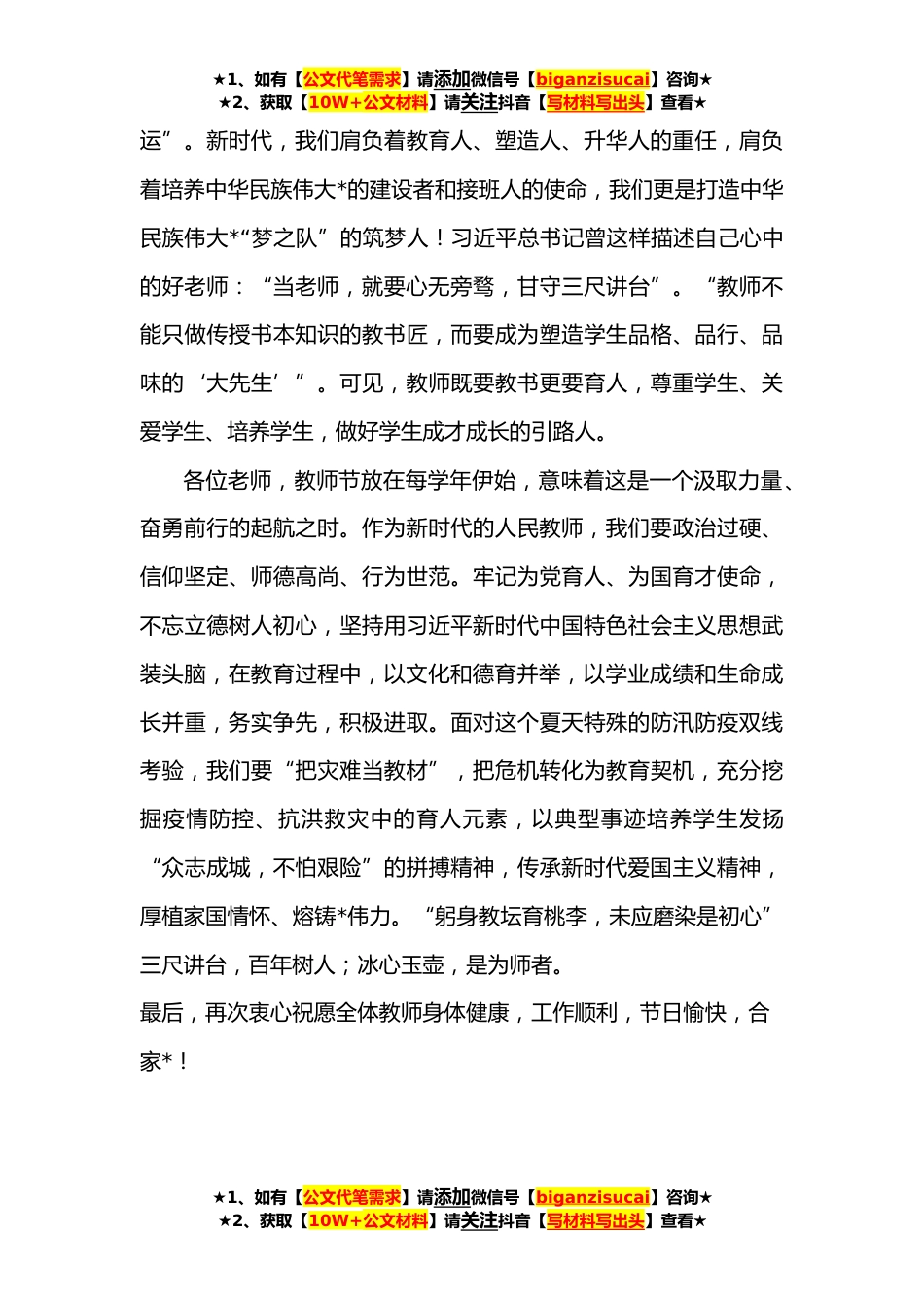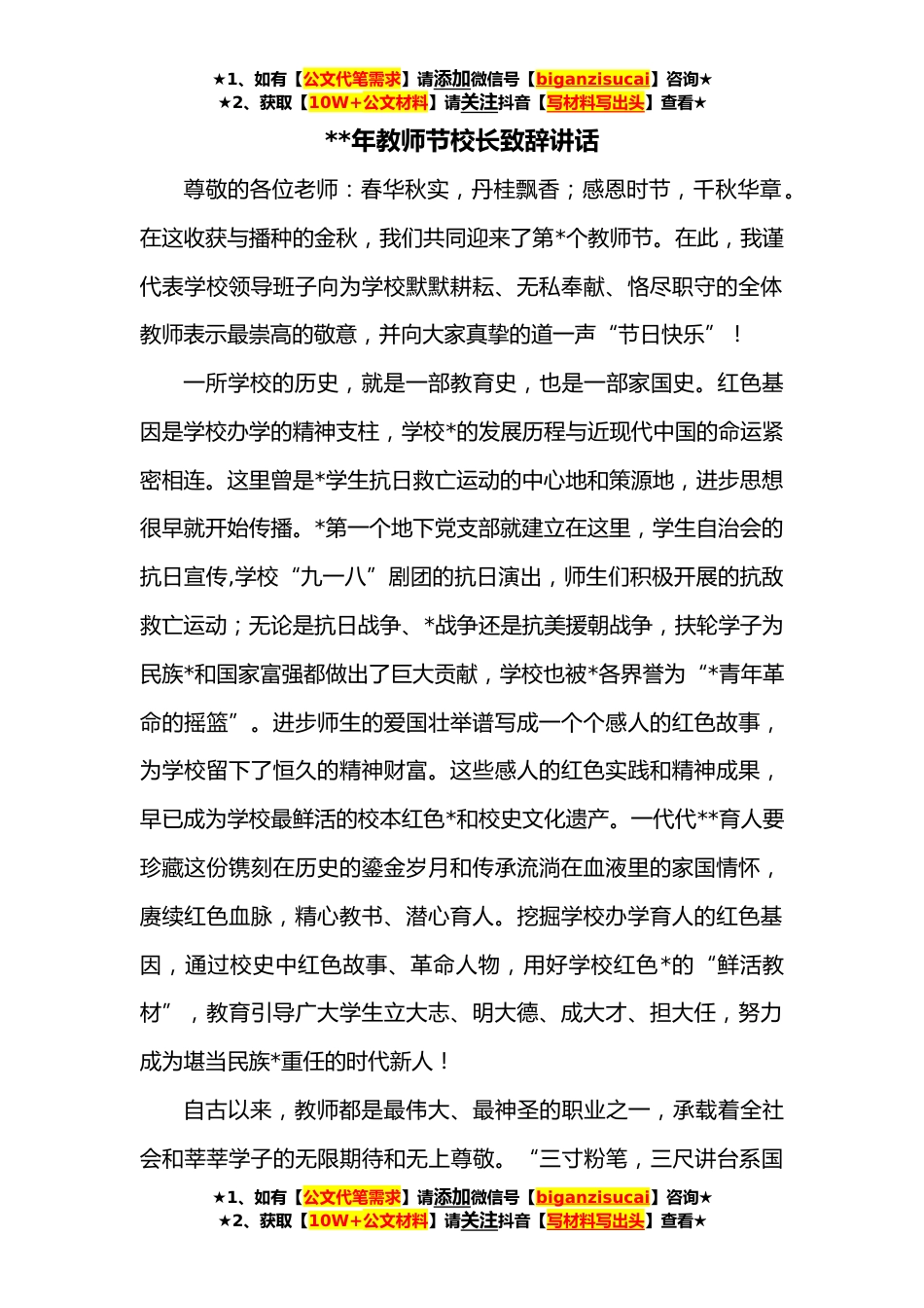 ★1、如有【公文代笔需求】请添加微信号【biganzisucai】咨询★★2、获取【10W+公文材料】请关注抖音【写材料写出头】查看★**年教师节校长致辞讲话尊敬的各位老师:春华秋实,丹桂飘香;感恩时节,千秋华章。在这收获与播种的金秋,我们共同迎来了第*个教师节。在此,我谨代表学校领导班子向为学校默默耕耘、无私奉献、恪尽职守的全体教师表示最崇高的敬意,并向大家真挚的道一声“节日快乐”!一所学校的历史,就是一部教育史,也是一部家国史。红色基因是学校办学的精神支柱,学校*的发展历程与近现代中国的命运紧密相连。这里曾是*学生抗日救亡运动的中心地和策源地,进步思想很早就开始传播。*第一个地下党支部就建立在这里,学生自治会的抗日宣传,学校“九一八”剧团的抗日演出,师生们积极开展的抗敌救亡运...
