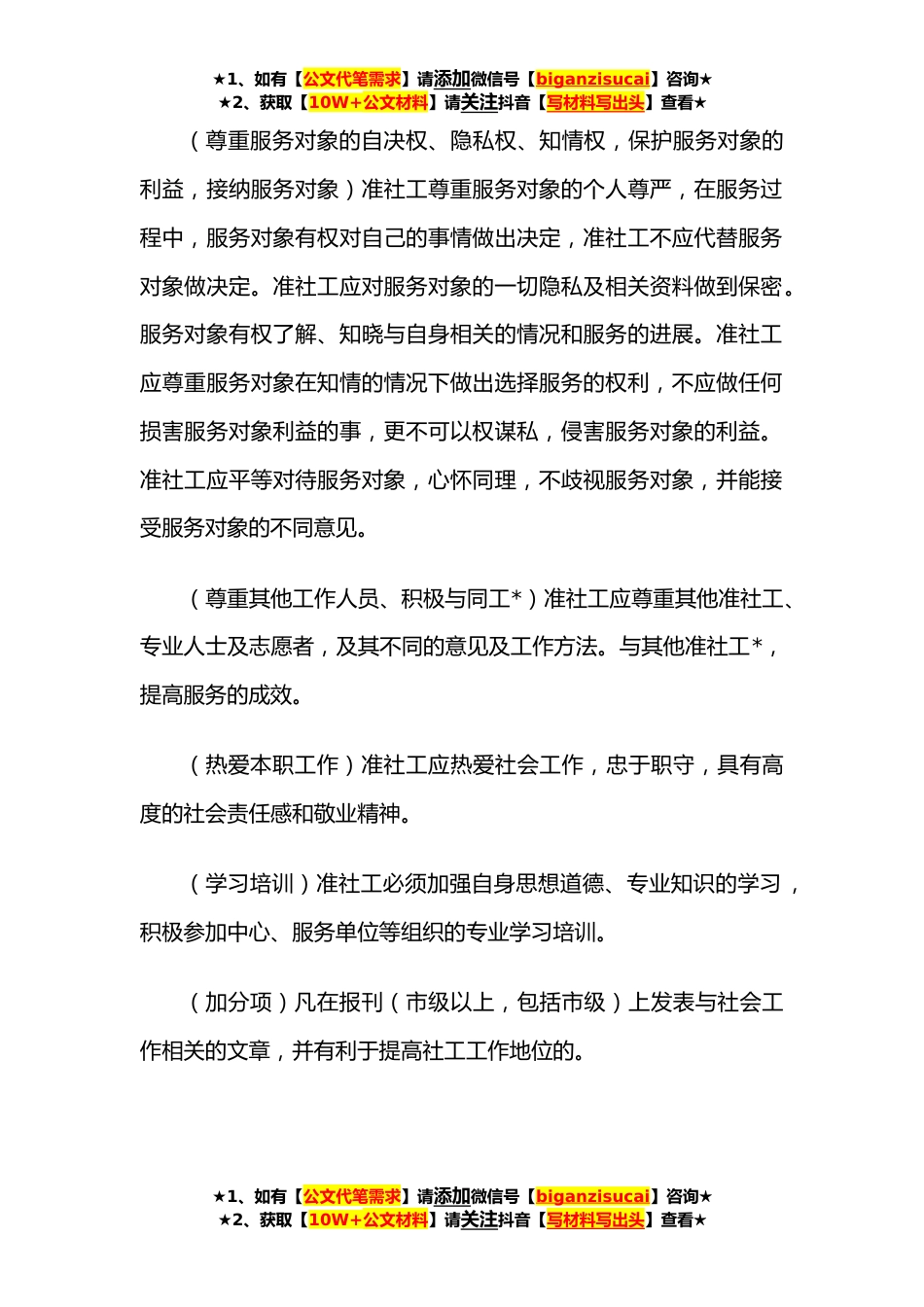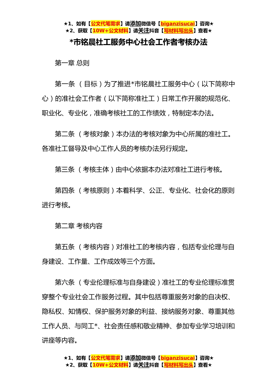 ★1、如有【公文代笔需求】请添加微信号【biganzisucai】咨询★★2、获取【10W+公文材料】请关注抖音【写材料写出头】查看★*市铭晨社工服务中心社会工作者考核办法第一章总则第一条(目标)为了推进*市铭晨社工服务中心(以下简称中心)的准社会工作者(以下简称准社工)日常工作开展的规范化、职业化、专业化,准确考核社工的工作绩效,特制定本办法。第二条(考核对象)本办法的考核对象为中心所属的准社工。各准社工督导及中心工作人员的考核办法另行规定。第三条(考核主体)由中心依据本办法对准社工进行考核。第四条(考核原则)本着科学、公正、专业化、社会化的原则进行考核。第二章考核内容第五条(考核内容)对准社工的考核内容,包括专业伦理与自身建设、工作量、工作成效等三个方面。第六条(专业伦...