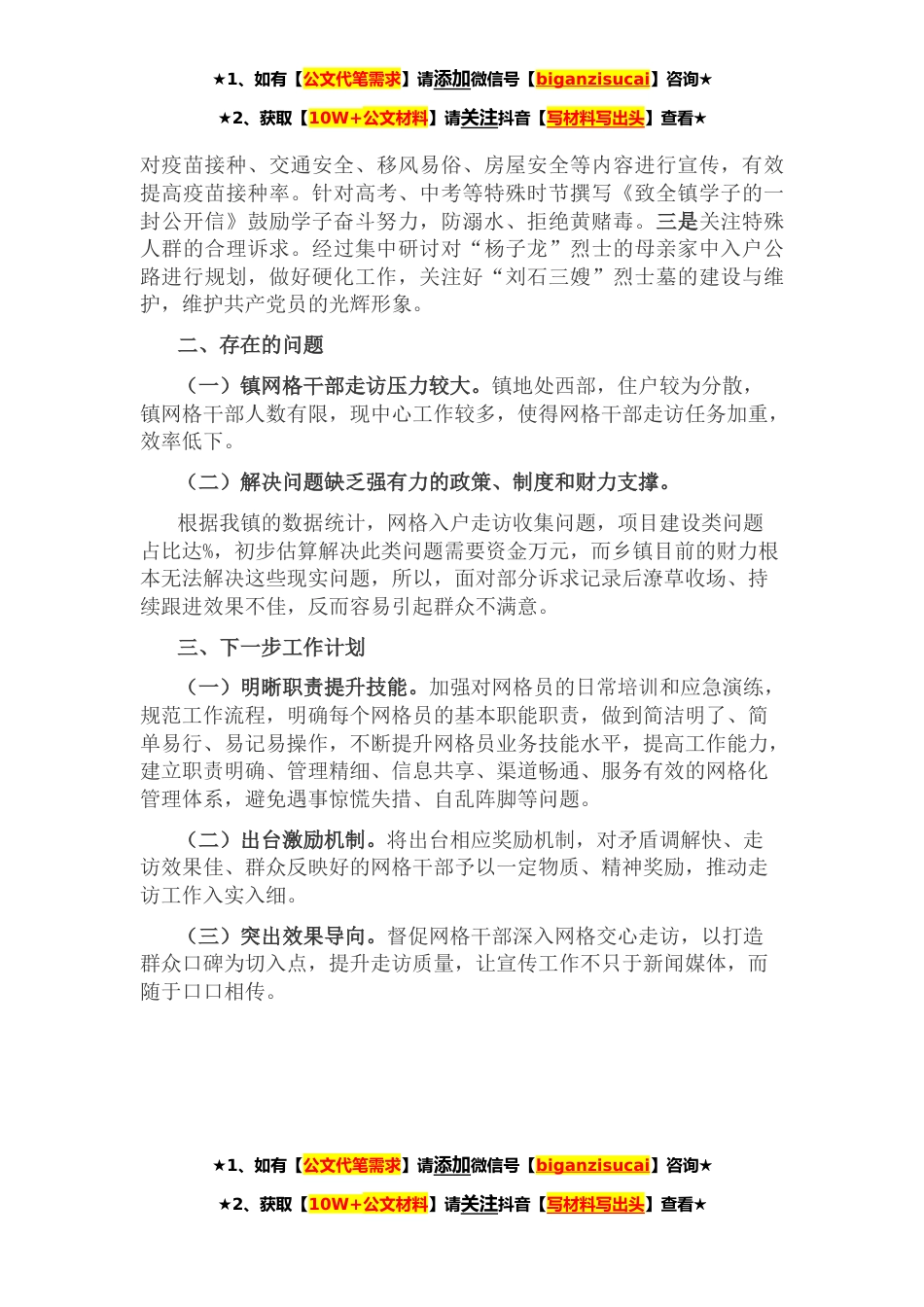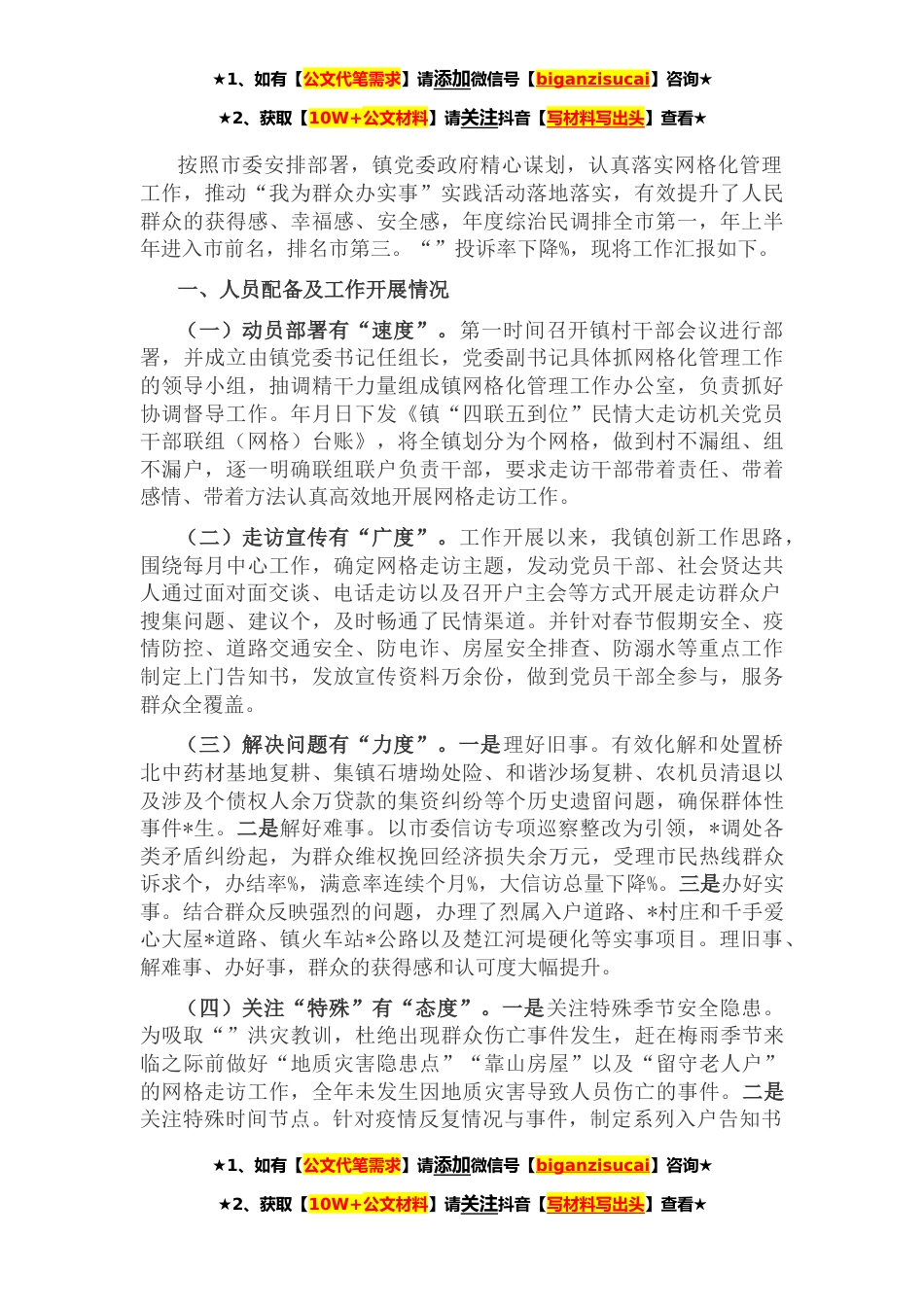 ★1、如有【公文代笔需求】请添加微信号【biganzisucai】咨询★★2、获取【10W+公文材料】请关注抖音【写材料写出头】查看★按照市委安排部署,镇党委政府精心谋划,认真落实网格化管理工作,推动“我为群众办实事”实践活动落地落实,有效提升了人民群众的获得感、幸福感、安全感,年度综治民调排全市第一,年上半年进入市前名,排名市第三。“”投诉率下降%,现将工作汇报如下。一、人员配备及工作开展情况(一)动员部署有“速度”。第一时间召开镇村干部会议进行部署,并成立由镇党委书记任组长,党委副书记具体抓网格化管理工作的领导小组,抽调精干力量组成镇网格化管理工作办公室,负责抓好协调督导工作。年月日下发《镇“四联五到位”民情大走访机关党员干部联组(网格)台账》,将全镇划分为个网格,做到...