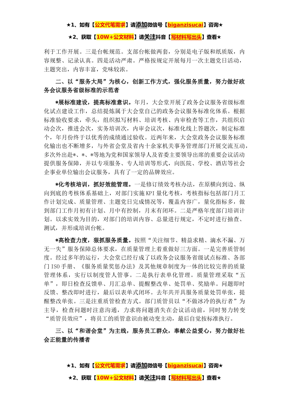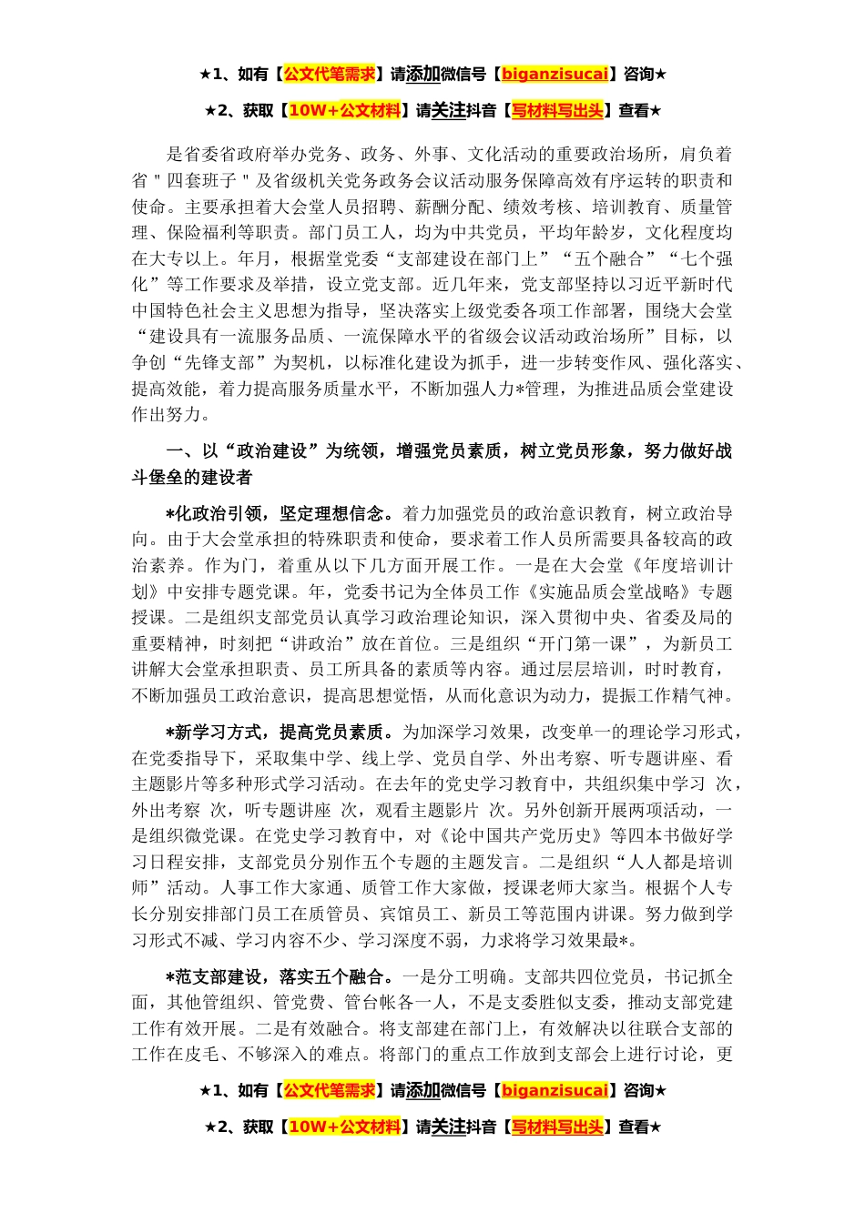 ★1、如有【公文代笔需求】请添加微信号【biganzisucai】咨询★★2、获取【10W+公文材料】请关注抖音【写材料写出头】查看★是省委省政府举办党务、政务、外事、文化活动的重要政治场所,肩负着省"四套班子"及省级机关党务政务会议活动服务保障高效有序运转的职责和使命。主要承担着大会堂人员招聘、薪酬分配、绩效考核、培训教育、质量管理、保险福利等职责。部门员工人,均为中共党员,平均年龄岁,文化程度均在大专以上。年月,根据堂党委“支部建设在部门上”“五个融合”“七个强化”等工作要求及举措,设立党支部。近几年来,党支部坚持以习近平新时代中国特色社会主义思想为指导,坚决落实上级党委各项工作部署,围绕大会堂“建设具有一流服务品质、一流保障水平的省级会议活动政治场所”目标,以争创“...