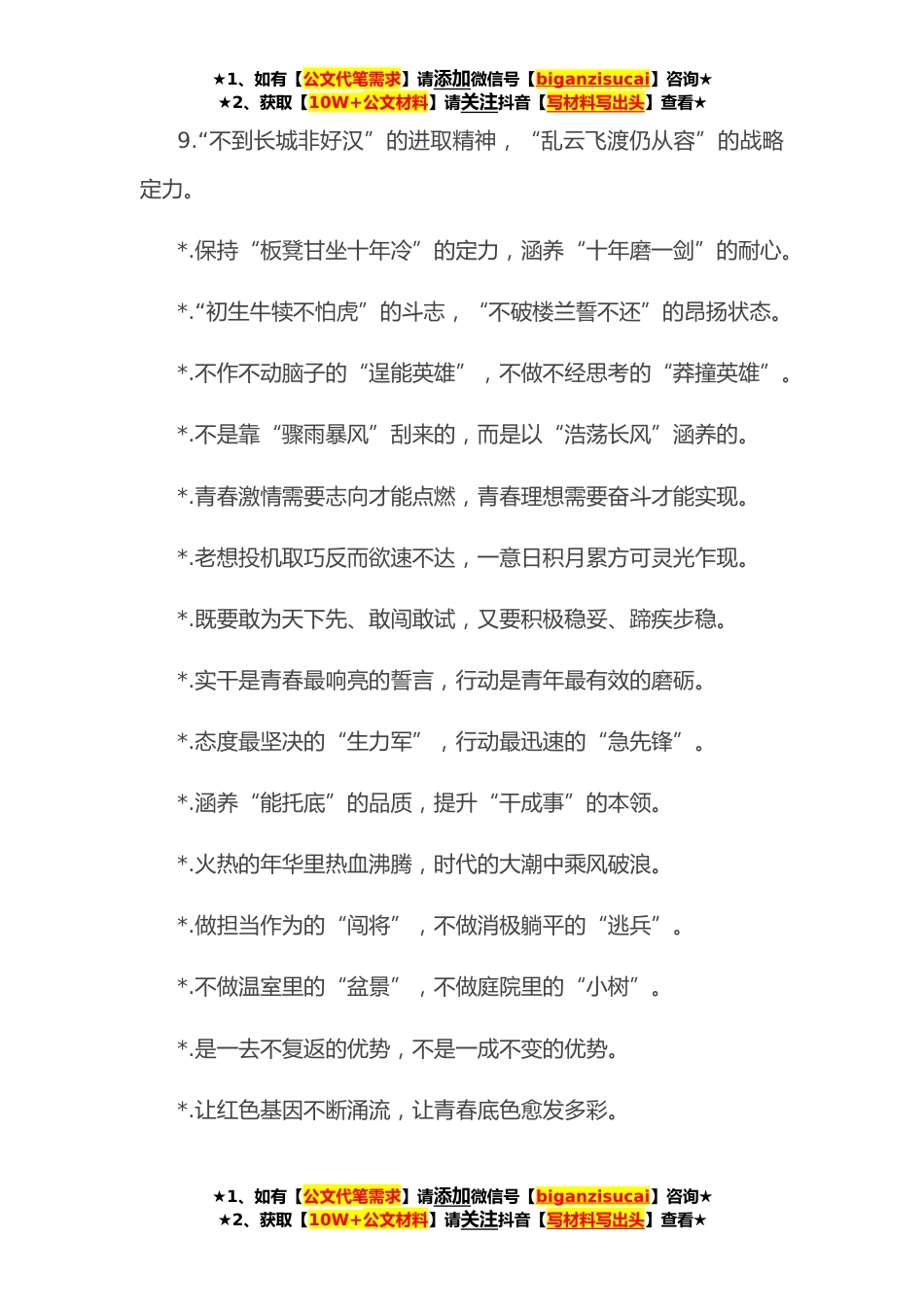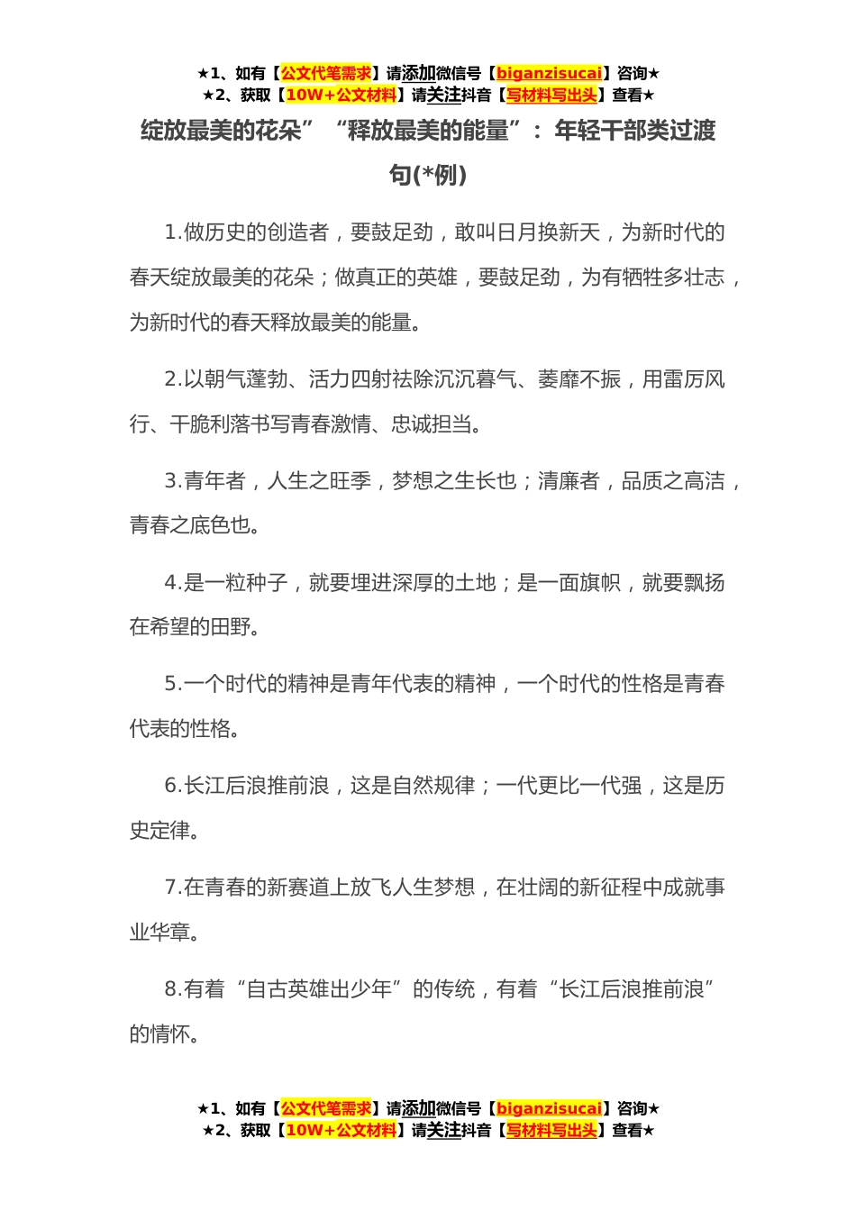 ★1、如有【公文代笔需求】请添加微信号【biganzisucai】咨询★★2、获取【10W+公文材料】请关注抖音【写材料写出头】查看★绽放最美的花朵”“释放最美的能量”:年轻干部类过渡句(*例)1.做历史的创造者,要鼓足劲,敢叫日月换新天,为新时代的春天绽放最美的花朵;做真正的英雄,要鼓足劲,为有牺牲多壮志,为新时代的春天释放最美的能量。2.以朝气蓬勃、活力四射祛除沉沉暮气、萎靡不振,用雷厉风行、干脆利落书写青春激情、忠诚担当。3.青年者,人生之旺季,梦想之生长也;清廉者,品质之高洁,青春之底色也。4.是一粒种子,就要埋进深厚的土地;是一面旗帜,就要飘扬在希望的田野。5.一个时代的精神是青年代表的精神,一个时代的性格是青春代表的性格。6.长江后浪推前浪,这是自然规律;一代更比一代强,这是...