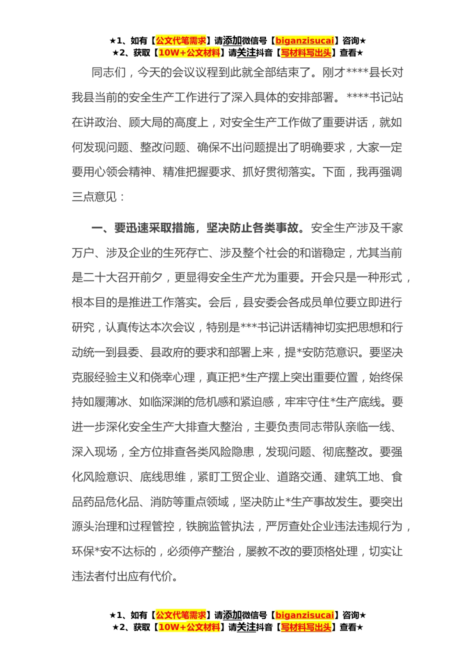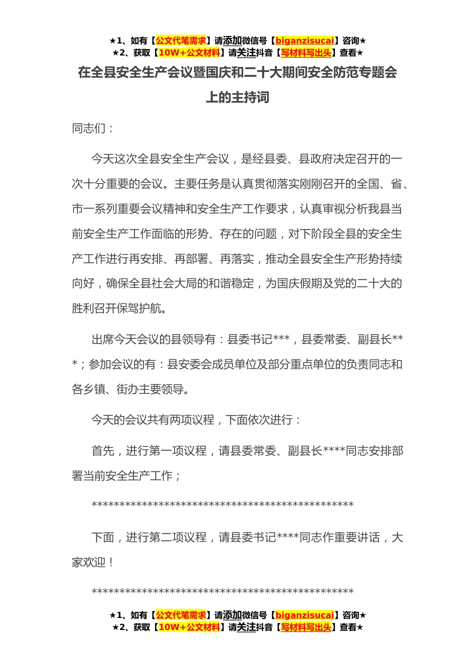 ★1、如有【公文代笔需求】请添加微信号【biganzisucai】咨询★★2、获取【10W+公文材料】请关注抖音【写材料写出头】查看★在全县安全生产会议暨国庆和二十大期间安全防范专题会上的主持词同志们:今天这次全县安全生产会议,是经县委、县政府决定召开的一次十分重要的会议。主要任务是认真贯彻落实刚刚召开的全国、省、市一系列重要会议精神和安全生产工作要求,认真审视分析我县当前安全生产工作面临的形势、存在的问题,对下阶段全县的安全生产工作进行再安排、再部署、再落实,推动全县安全生产形势持续向好,确保全县社会大局的和谐稳定,为国庆假期及党的二十大的胜利召开保驾护航。出席今天会议的县领导有:县委书记***,县委常委、副县长***;参加会议的有:县安委会成员单位及部分重点单位的负责同志和...