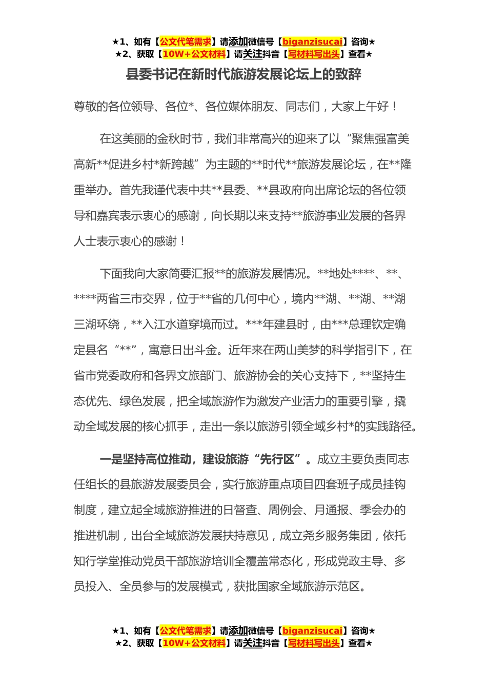 ★1、如有【公文代笔需求】请添加微信号【biganzisucai】咨询★★2、获取【10W+公文材料】请关注抖音【写材料写出头】查看★县委书记在新时代旅游发展论坛上的致辞尊敬的各位领导、各位*、各位媒体朋友、同志们,大家上午好!在这美丽的金秋时节,我们非常高兴的迎来了以“聚焦强富美高新**促进乡村*新跨越”为主题的**时代**旅游发展论坛,在**隆重举办。首先我谨代表中共**县委、**县政府向出席论坛的各位领导和嘉宾表示衷心的感谢,向长期以来支持**旅游事业发展的各界人士表示衷心的感谢!下面我向大家简要汇报**的旅游发展情况。**地处****、**、****两省三市交界,位于**省的几何中心,境内**湖、**湖、**湖三湖环绕,**入江水道穿境而过。***年建县时,由***总理钦定确定县名“**”,寓意日出斗金。近年来...