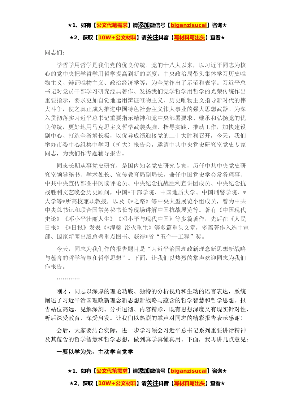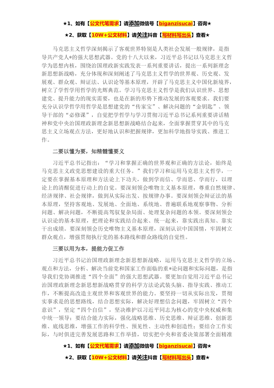 ★1、如有【公文代笔需求】请添加微信号【biganzisucai】咨询★★2、获取【10W+公文材料】请关注抖音【写材料写出头】查看★同志们:学哲学用哲学是我们党的优良传统。党的十八大以来,以习近平同志为核心的党中央把学哲学用哲学提高到新的高度,中央政治局带头集体学习历史唯物主义、辩证唯物主义、政治经济学等,为全党作出了示范和表率。习近平总书记对党员干部学习研究经典著作、发扬我们党学哲学用哲学的光荣传统作出重要指示,要求更加自觉地运用辩证唯物主义、历史唯物主义指导新时代的伟大斗争,使之真正成为推进中国特色社会主义伟大事业的强大思想武器。为深入贯彻落实习近平总书记重要指示精神和党中央部署要求、继承和弘扬党的优良传统,更好地用马克思主义哲学武装头脑、指导实践、推动工作,加快建...