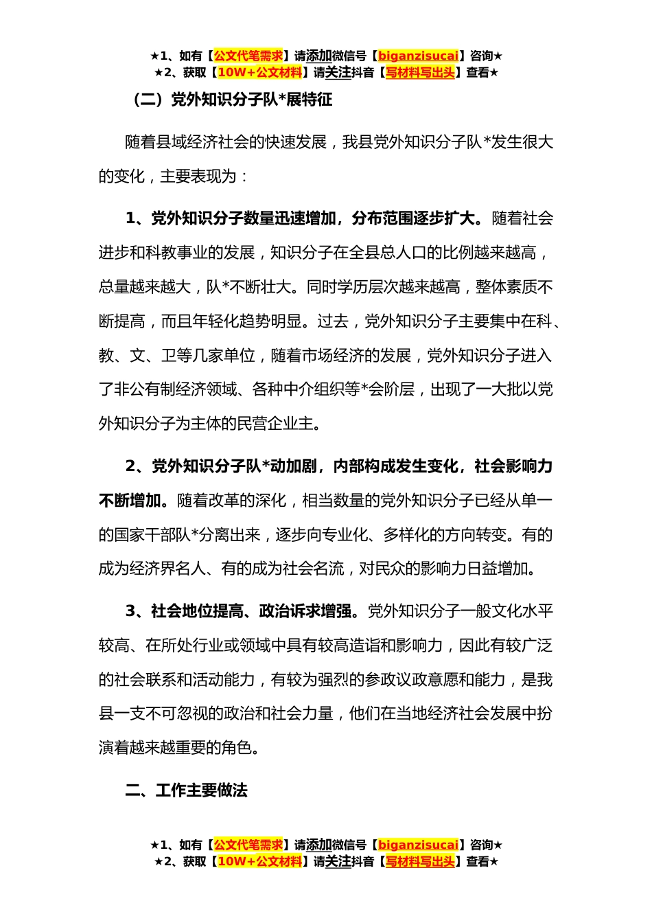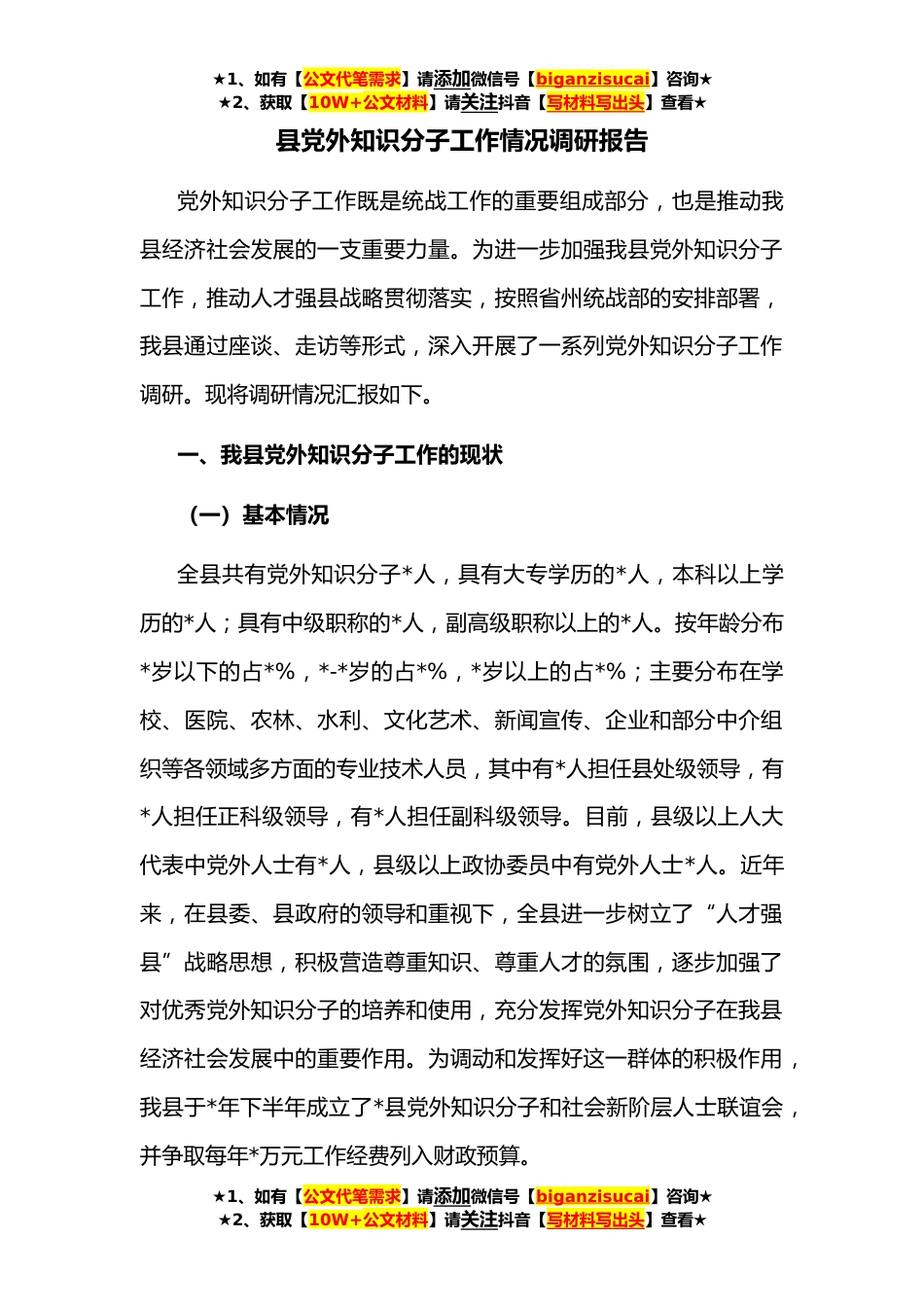 ★1、如有【公文代笔需求】请添加微信号【biganzisucai】咨询★★2、获取【10W+公文材料】请关注抖音【写材料写出头】查看★县党外知识分子工作情况调研报告党外知识分子工作既是统战工作的重要组成部分,也是推动我县经济社会发展的一支重要力量。为进一步加强我县党外知识分子工作,推动人才强县战略贯彻落实,按照省州统战部的安排部署,我县通过座谈、走访等形式,深入开展了一系列党外知识分子工作调研。现将调研情况汇报如下。一、我县党外知识分子工作的现状(一)基本情况全县共有党外知识分子*人,具有大专学历的*人,本科以上学历的*人;具有中级职称的*人,副高级职称以上的*人。按年龄分布*岁以下的占*%,*-*岁的占*%,*岁以上的占*%;主要分布在学校、医院、农林、水利、文化艺术、新闻宣传、企业和...