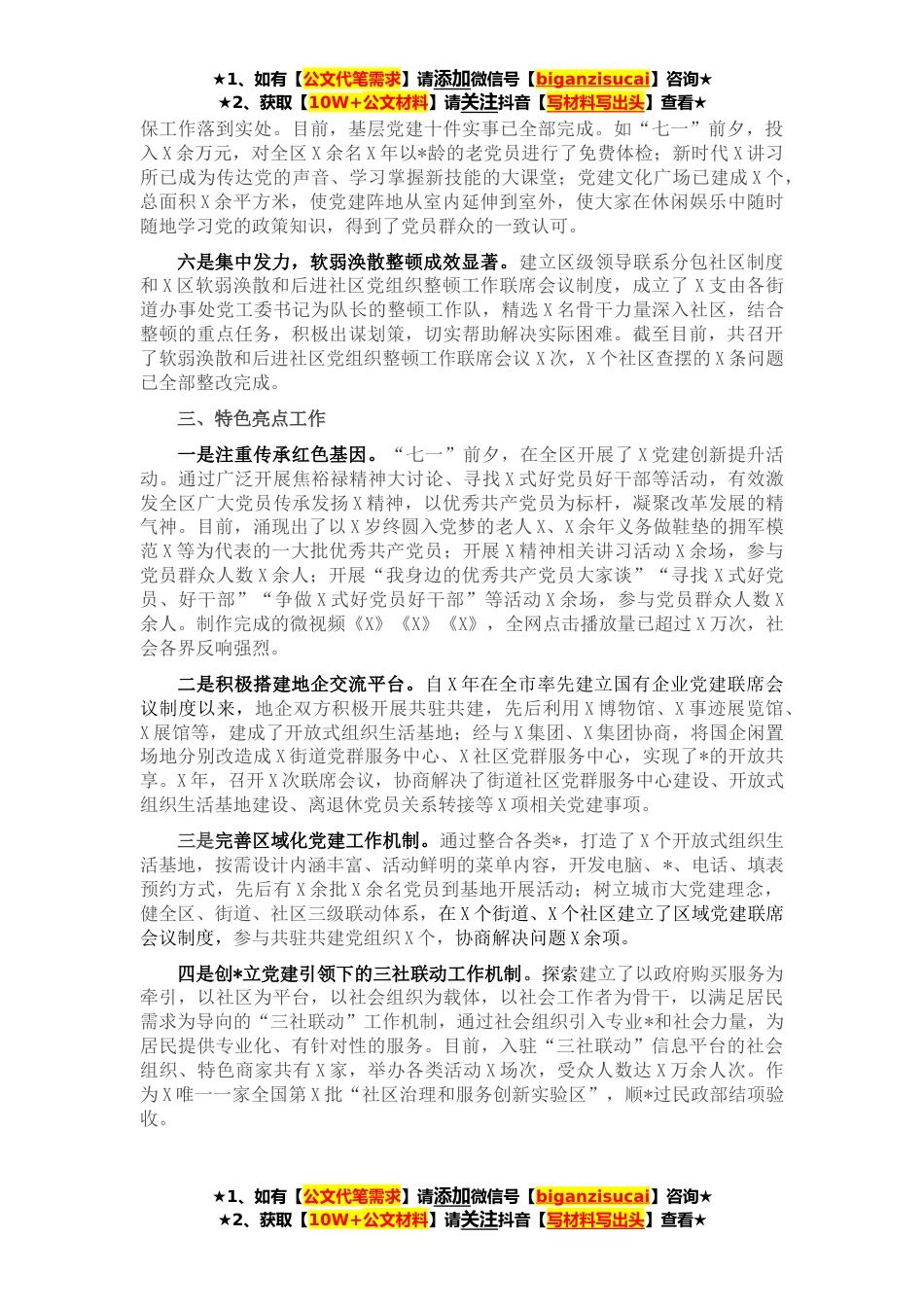 ★1、如有【公文代笔需求】请添加微信号【biganzisucai】咨询★★2、获取【10W+公文材料】请关注抖音【写材料写出头】查看★近三年来,X区紧紧围绕市委提出的“X党建计划”全面进步年工作要求,以实施X党建工程为载体,以开展X活动为抓手,全领域推进城市基层党建工作,为着力打造最具创新活力、最具创业激情的“首善之区”提供坚强组织保障。一、基本情况X区辖X个街道,X个社区(其中城市社区X个,村改居社区X个)。目前,全区共有基层党组织X个(其中,党(工)委X个,党总支X个,党支部X个),党员X名。X年,X街道办事处党工委X社区党委被中共中央授予“全国先进基层党组织”;X街道办事处党工委X社区党委、X街道办事处党工委所属的X心理咨询师协会党支部被X省委授予“全省先进基层党组织”;X个党组织被授予市...