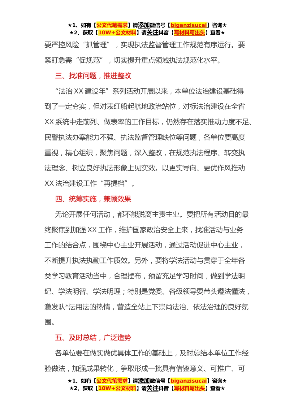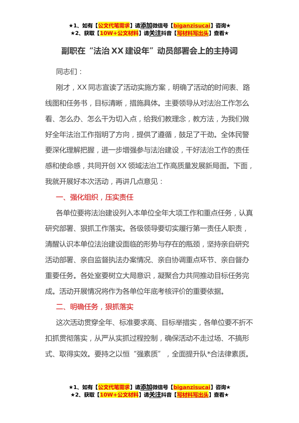 ★1、如有【公文代笔需求】请添加微信号【biganzisucai】咨询★★2、获取【10W+公文材料】请关注抖音【写材料写出头】查看★副职在“法治XX建设年”动员部署会上的主持词同志们:刚才,XX同志宣读了活动实施方案,明确了活动的时间表、路线图和任务书,目标清晰,措施具体。主要领导从对法治工作怎么看、怎么办、怎么干为切入点,给我们教理念,教方法,为我们做好全年法治工作指明了方向,提供了遵循,鼓足了干劲。全体民警要深化理解把握,进一步增强参与法治建设,干好法治工作的责任感和使命感,共同开创XX领域法治工作高质量发展新局面。下面,我就开展好本次活动,再讲几点意见:一、强化组织,压实责任各单位要将法治建设列入本单位全年大项工作和重点任务,认真研究部署、狠抓工作落实。各级领导要切实履...