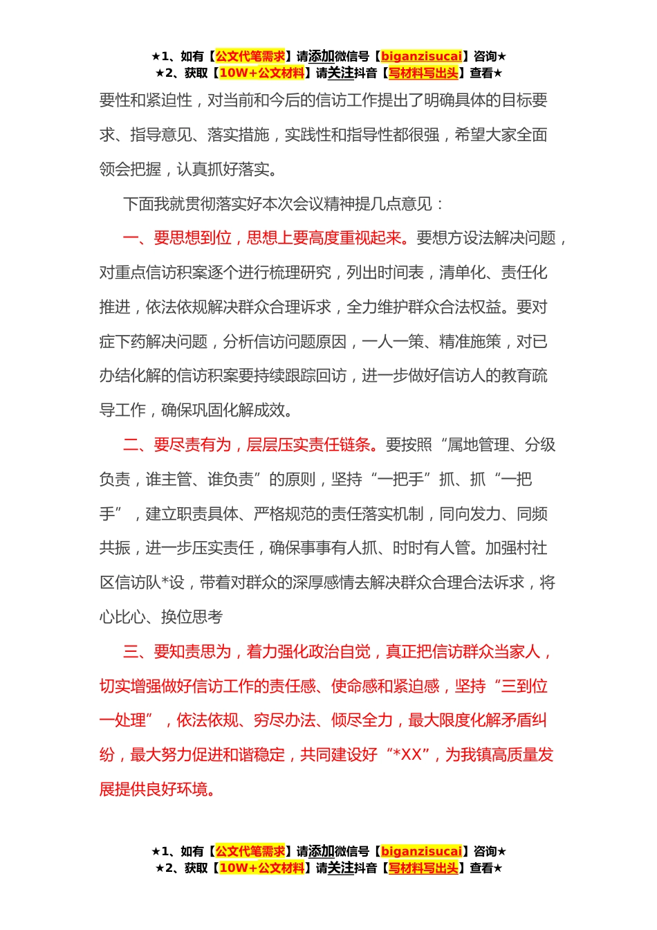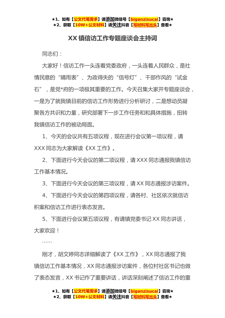 ★1、如有【公文代笔需求】请添加微信号【biganzisucai】咨询★★2、获取【10W+公文材料】请关注抖音【写材料写出头】查看★XX镇信访工作专题座谈会主持词同志们:大家好!信访工作一头连着党委政府,一头连着人民群众,是社情民意的“晴雨表”、为政得失的“信号灯”、干部作风的“试金石”,是党*府的一项极其重要的工作。今天召集大家开专题座谈会,一是为了就我镇目前的信访工作形势进行分析研讨,二是想动员凝聚各方共识和力量,研究部署下一步工作任务和和具体措施,扭转我镇信访工作的被动局面。1、今天的会议共有五项议程,现在进行会议第一项议程,请XXX同志为大家解读《XX工作》。2、下面进行今天会议的第二项议程,请XXX同志通报我镇信访工作基本情况。3、下面进行今天会议的第三项议程,请XX同志通报...