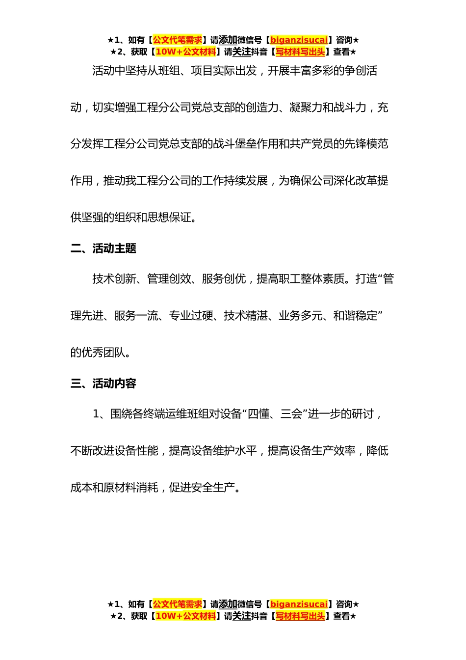 ★1、如有【公文代笔需求】请添加微信号【biganzisucai】咨询★★2、获取【10W+公文材料】请关注抖音【写材料写出头】查看★《创新、创效、创优》工作室活动方案xxx公司目录按照xx公司党[**]*文件要求,工程分公司党总支部全体党“”员、职工中开展创新、创优、创效活动,为确保活动健康有序开展,现结合xx分公司运行、项目实际制定如下方案:一、指导思想深入贯彻落实党的十八大和十八届三中、四中全会精神,紧紧“”围绕深化改革破解难题提质增效科学发展的总要求,紧跟《xxxxxx“”“”中长期发展规划》目标,以实施五服务和两加强为主线,坚持党建思想政治工作融入企业中心工作中、在公司转型升“级的进程中充分发挥党组织和党员干部作用,开展好创新、创效、”创优工作室活动。★1、如有【公文代笔需求】请添...