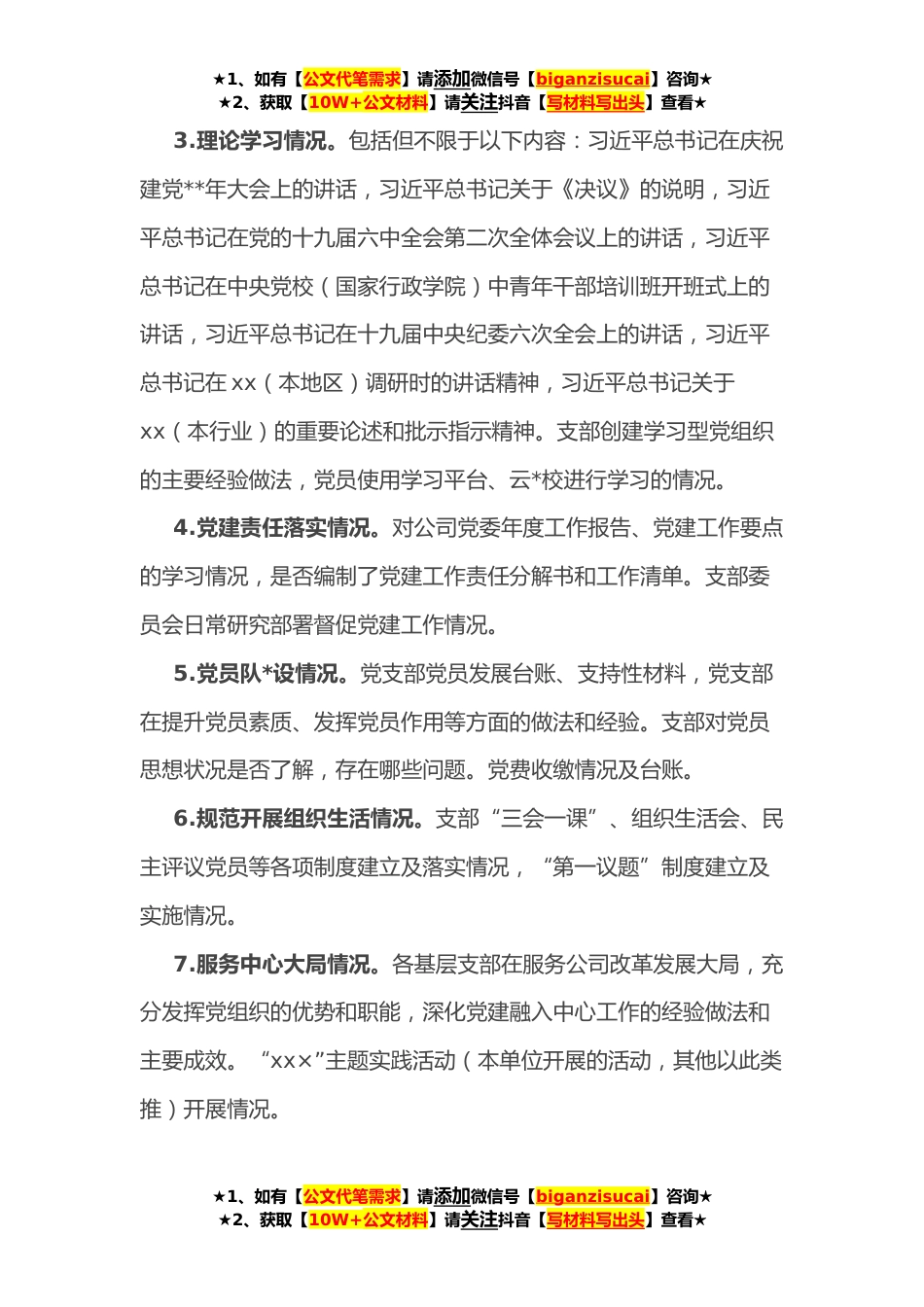 ★1、如有【公文代笔需求】请添加微信号【biganzisucai】咨询★★2、获取【10W+公文材料】请关注抖音【写材料写出头】查看★xx公司基层党组织党建基础工作调研方案各党支部:为进一步强化党建工作基础管理,深化党支部标准化规范化建设,强化“xxxx”党支部建设(本单位特色工作,下同),着力打造坚强有力的战斗堡垒,公司党委计划在*下旬至*上旬开展党建工作专题调研,制定实施方案如下:一、调研主题筑牢党建基础,提高党建质量,以优异成绩迎接党的二十大胜利召开。二、调研方式由公司党委有关领导组织有关部门党务干部成立*调研组,通过到各党支部实地检查、听取汇报、座谈交流、查阅资料等手段,了解近两年党建工作开展情况,了解基层支部加强“三基”管理、深化党建融合、提升政治功能和组织力情况,了解党...