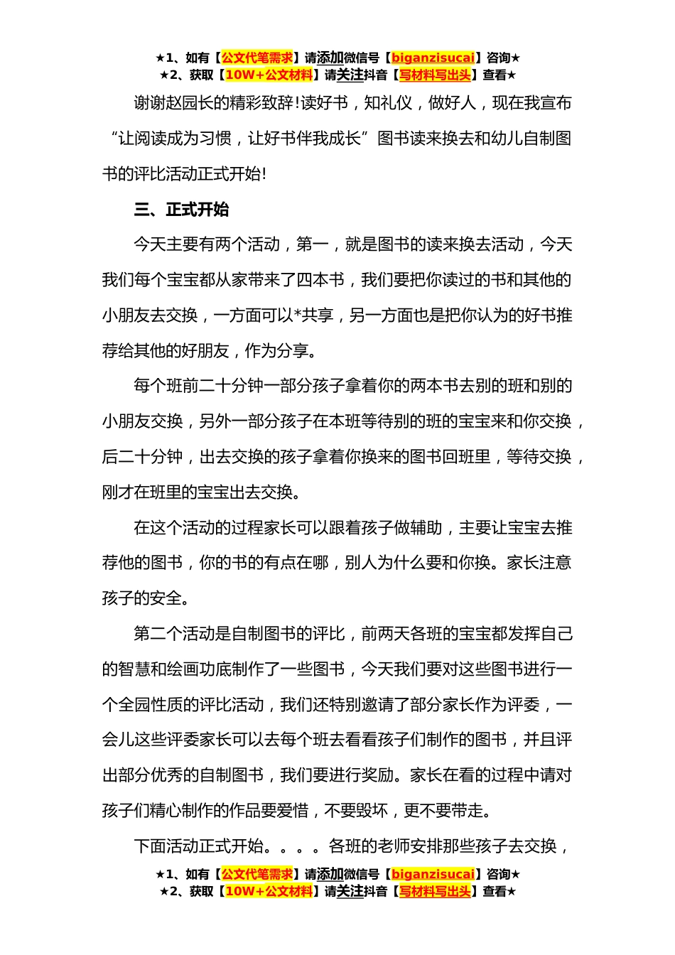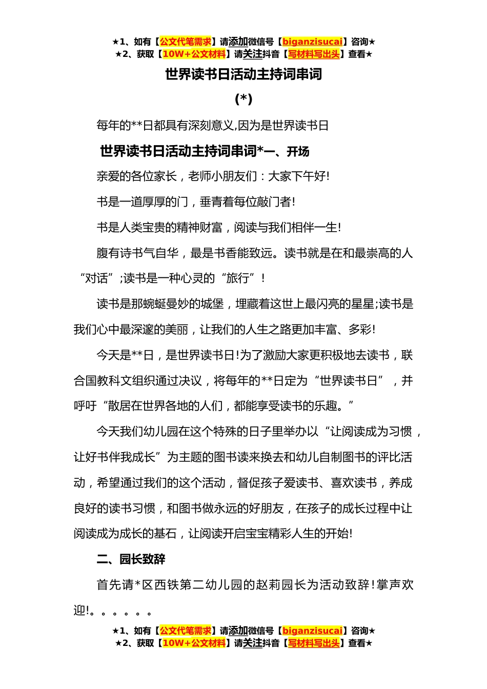 ★1、如有【公文代笔需求】请添加微信号【biganzisucai】咨询★★2、获取【10W+公文材料】请关注抖音【写材料写出头】查看★世界读书日活动主持词串词(*)每年的**日都具有深刻意义,因为是世界读书日世界读书日活动主持词串词*一、开场亲爱的各位家长,老师小朋友们:大家下午好!书是一道厚厚的门,垂青着每位敲门者!书是人类宝贵的精神财富,阅读与我们相伴一生!腹有诗书气自华,最是书香能致远。读书就是在和最崇高的人“对话”;读书是一种心灵的“旅行”!读书是那蜿蜒曼妙的城堡,埋藏着这世上最闪亮的星星;读书是我们心中最深邃的美丽,让我们的人生之路更加丰富、多彩!今天是**日,是世界读书日!为了激励大家更积极地去读书,联合国教科文组织通过决议,将每年的**日定为“世界读书日”,并呼吁“散居在世界各...