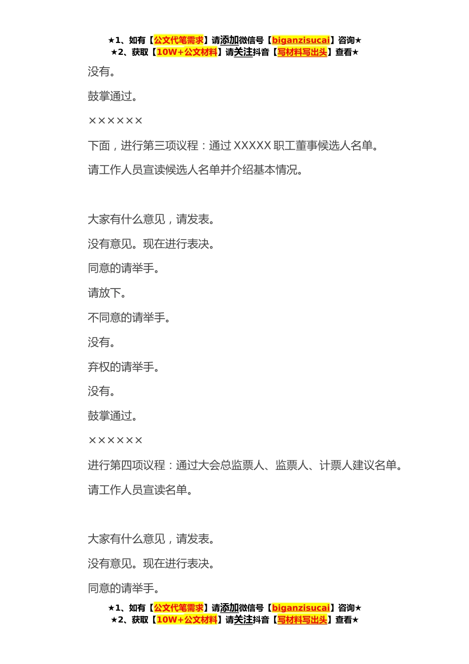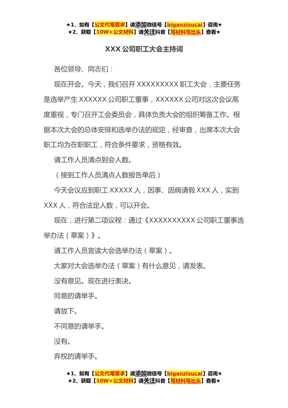 ★1、如有【公文代笔需求】请添加微信号【biganzisucai】咨询★★2、获取【10W+公文材料】请关注抖音【写材料写出头】查看★XXX公司职工大会主持词各位领导、同志们:现在开会。今天,我们召开XXXXXXXXX职工大会,主要任务是选举产生XXXXXX公司职工董事,XXXXXX公司对这次会议高度重视,专门召开工会委员会,具体负责大会的组织筹备工作。根据本次大会的总体安排和选举办法的规定,经审查,出席本次大会职工均为在职职工,符合条件要求,资格有效。请工作人员清点到会人数。(接到工作人员清点人数报告单后)今天会议应到职工XXXXX人,因事、因病请假XXX人,实到XXX人,符合法定人数,可以开会。现在,进行第二项议程:通过《XXXXXXXXXX公司职工董事选举办法(草案)》。请工作人员宣读大会选举办法(草案)。大家...
