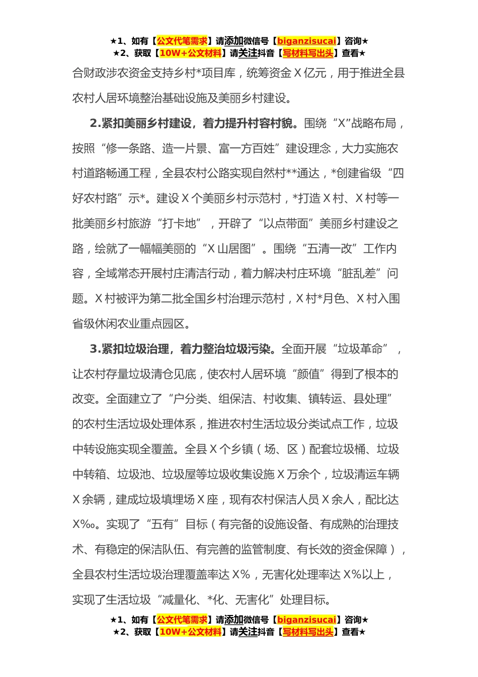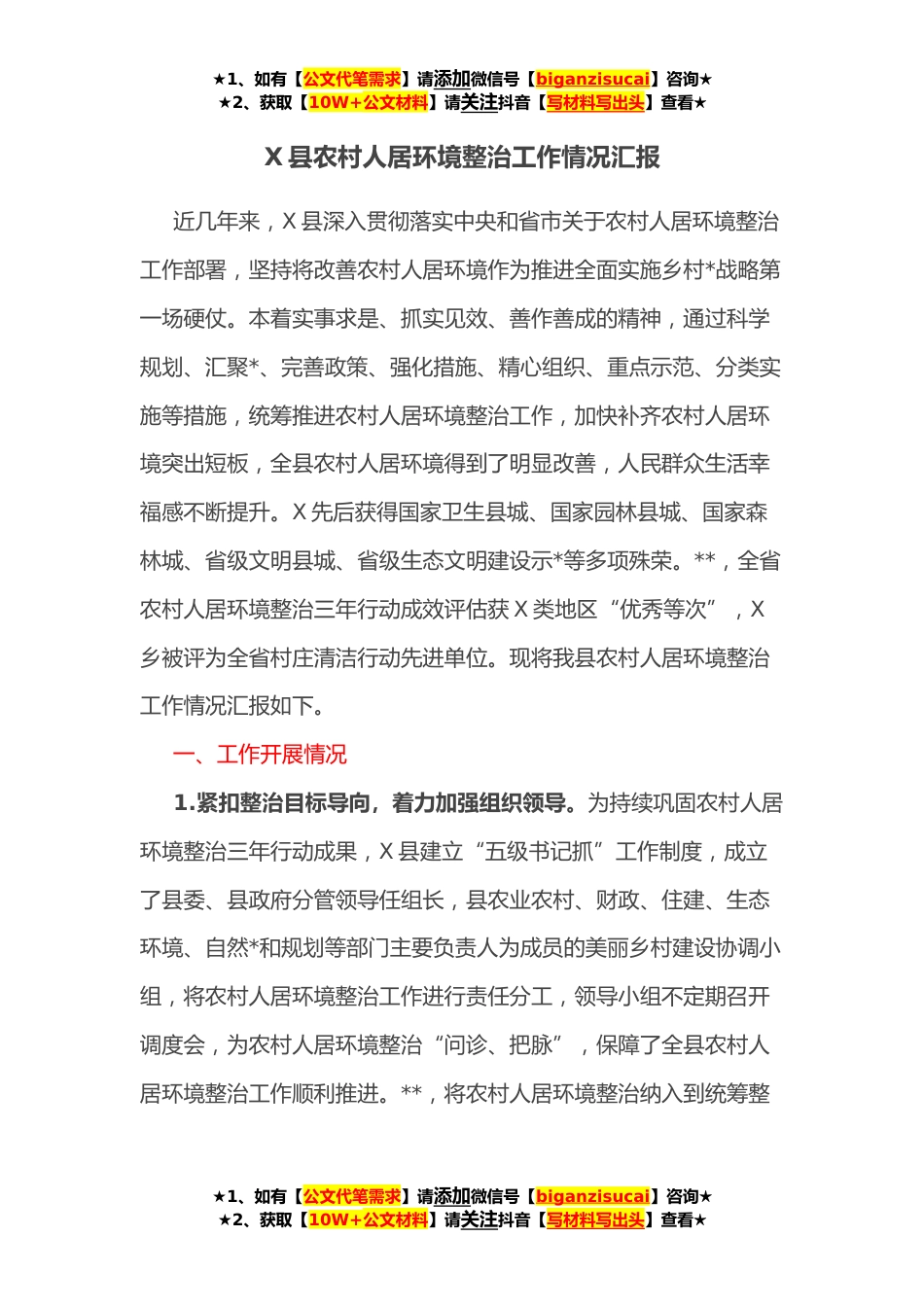 ★1、如有【公文代笔需求】请添加微信号【biganzisucai】咨询★★2、获取【10W+公文材料】请关注抖音【写材料写出头】查看★X县农村人居环境整治工作情况汇报近几年来,X县深入贯彻落实中央和省市关于农村人居环境整治工作部署,坚持将改善农村人居环境作为推进全面实施乡村*战略第一场硬仗。本着实事求是、抓实见效、善作善成的精神,通过科学规划、汇聚*、完善政策、强化措施、精心组织、重点示范、分类实施等措施,统筹推进农村人居环境整治工作,加快补齐农村人居环境突出短板,全县农村人居环境得到了明显改善,人民群众生活幸福感不断提升。X先后获得国家卫生县城、国家园林县城、国家森林城、省级文明县城、省级生态文明建设示*等多项殊荣。**,全省农村人居环境整治三年行动成效评估获X类地区“优秀等次”...