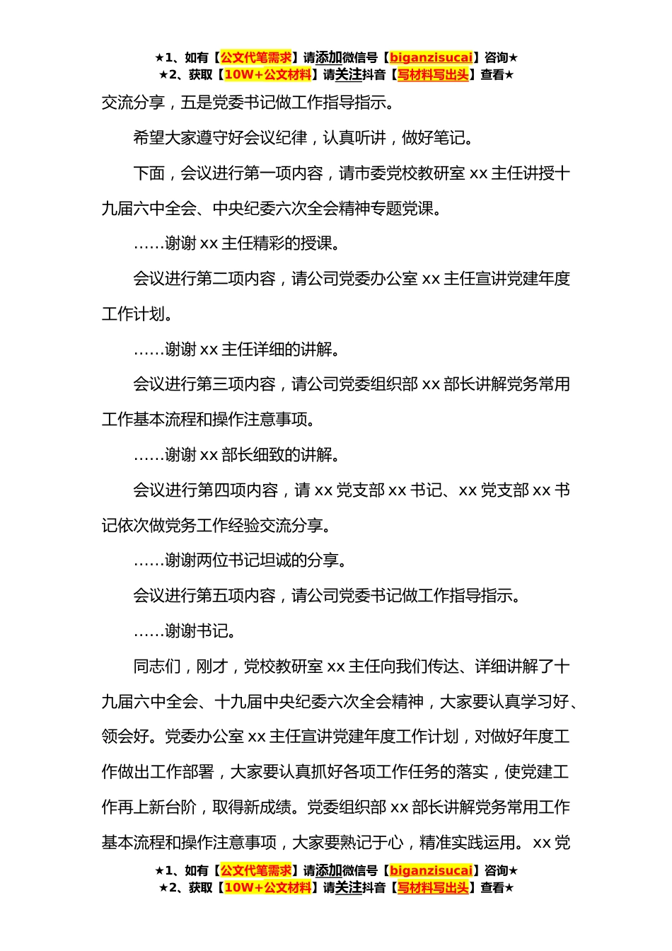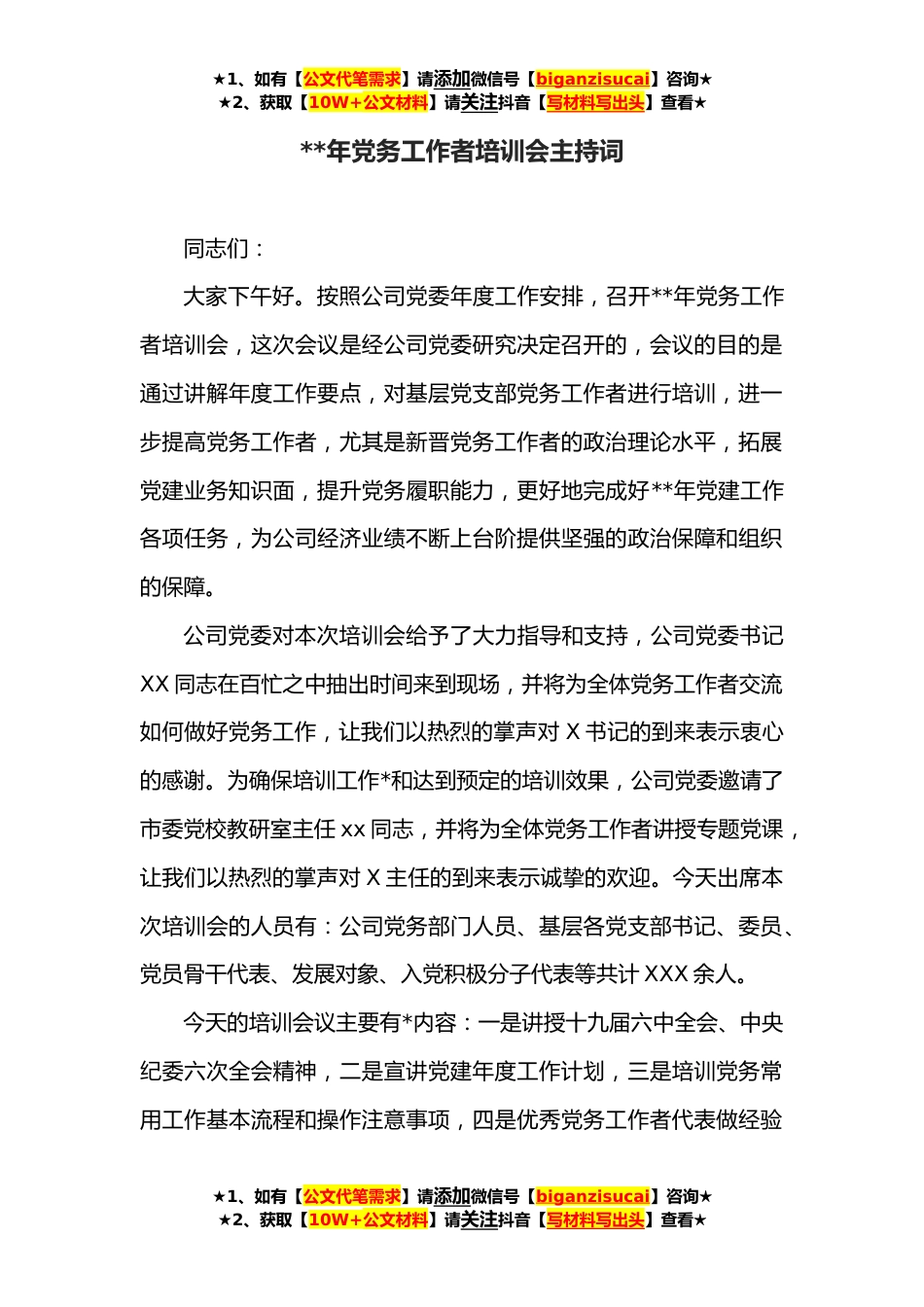 ★1、如有【公文代笔需求】请添加微信号【biganzisucai】咨询★★2、获取【10W+公文材料】请关注抖音【写材料写出头】查看★**年党务工作者培训会主持词同志们:大家下午好。按照公司党委年度工作安排,召开**年党务工作者培训会,这次会议是经公司党委研究决定召开的,会议的目的是通过讲解年度工作要点,对基层党支部党务工作者进行培训,进一步提高党务工作者,尤其是新晋党务工作者的政治理论水平,拓展党建业务知识面,提升党务履职能力,更好地完成好**年党建工作各项任务,为公司经济业绩不断上台阶提供坚强的政治保障和组织的保障。公司党委对本次培训会给予了大力指导和支持,公司党委书记XX同志在百忙之中抽出时间来到现场,并将为全体党务工作者交流如何做好党务工作,让我们以热烈的掌声对X书记的到来...