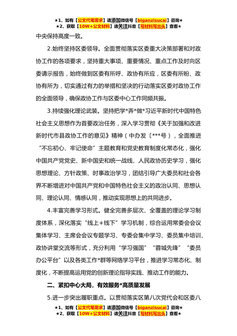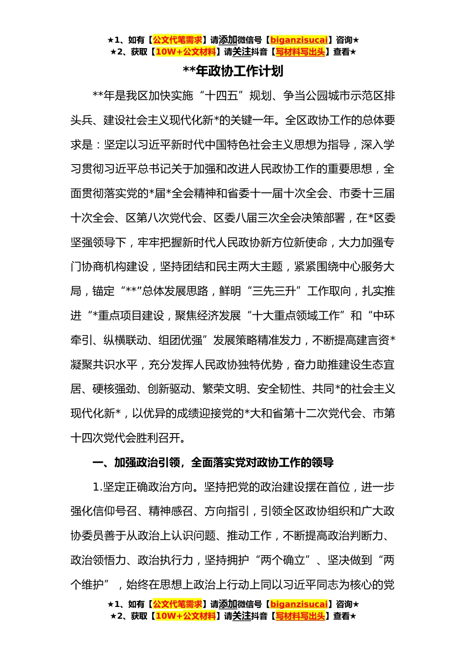 ★1、如有【公文代笔需求】请添加微信号【biganzisucai】咨询★★2、获取【10W+公文材料】请关注抖音【写材料写出头】查看★**年政协工作计划**年是我区加快实施“十四五”规划、争当公园城市示范区排头兵、建设社会主义现代化新*的关键一年。全区政协工作的总体要求是:坚定以习近平新时代中国特色社会主义思想为指导,深入学习贯彻习近平总书记关于加强和改进人民政协工作的重要思想,全面贯彻落实党的*届*全会精神和省委十一届十次全会、市委十三届十次全会、区第八次党代会、区委八届三次全会决策部署,在*区委坚强领导下,牢牢把握新时代人民政协新方位新使命,大力加强专门协商机构建设,坚持团结和民主两大主题,紧紧围绕中心服务大局,锚定“**”总体发展思路,鲜明“三先三升”工作取向,扎实推进“*重点...