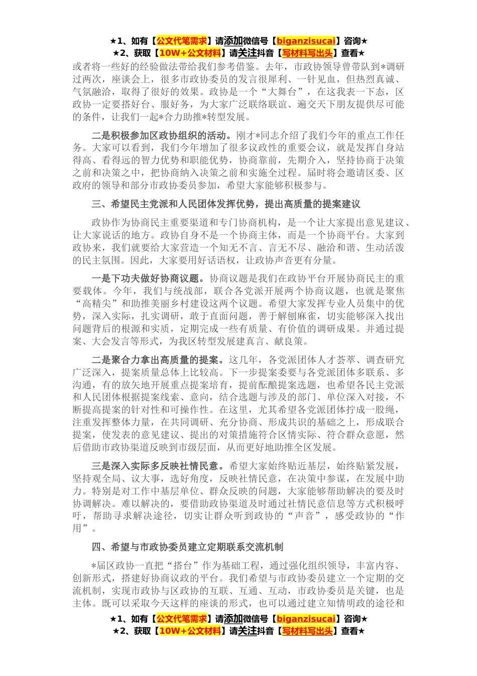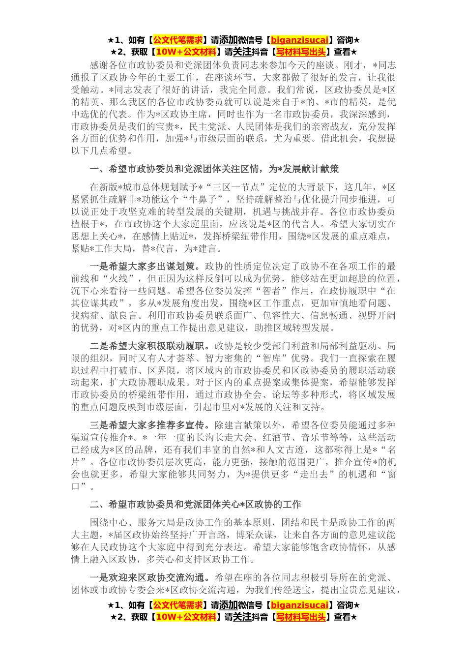★1、如有【公文代笔需求】请添加微信号【biganzisucai】咨询★★2、获取【10W+公文材料】请关注抖音【写材料写出头】查看★感谢各位市政协委员和党派团体负责同志来参加今天的座谈。刚才,*同志通报了区政协今年的主要工作,在座谈环节,大家都做了很好的发言,让我很受触动。*同志发表了很好的讲话,我完全同意。我们常说,区政协委员是*区的精英。那么我区的各位市政协委员就可以说是来自于*的、*市的精英,是优中选优的代表。作为*区政协主席,同时也作为一名市政协委员,我深深感到,市政协委员是我们的宝贵*,民主党派、人民团体是我们的亲密战友,充分发挥各方面的优势和作用,加强*与市级层面的联系,尤为重要。借此机会,我想提以下几点希望。一、希望市政协委员和党派团体关注区情,为*发展献计献策在新...