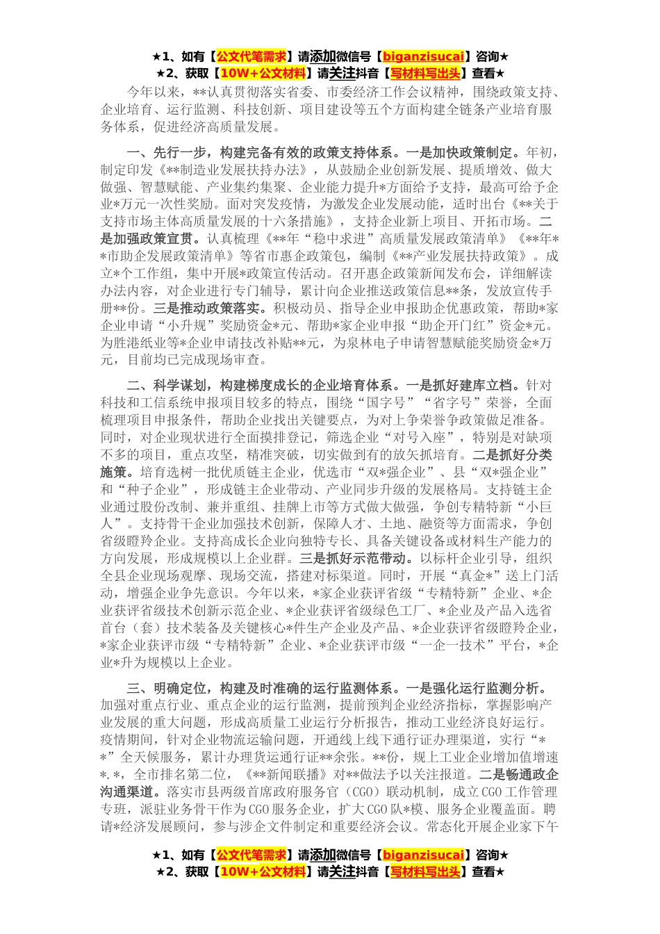 ★1、如有【公文代笔需求】请添加微信号【biganzisucai】咨询★★2、获取【10W+公文材料】请关注抖音【写材料写出头】查看★今年以来,**认真贯彻落实省委、市委经济工作会议精神,围绕政策支持、企业培育、运行监测、科技创新、项目建设等五个方面构建全链条产业培育服务体系,促进经济高质量发展。一、先行一步,构建完备有效的政策支持体系。一是加快政策制定。年初,制定印发《**制造业发展扶持办法》,从鼓励企业创新发展、提质增效、做大做强、智慧赋能、产业集约集聚、企业能力提升*方面给予支持,最高可给予企业*万元一次性奖励。面对突发疫情,为激发企业发展动能,适时出台《**关于支持市场主体高质量发展的十六条措施》,支持企业新上项目、开拓市场。二是加强政策宣贯。认真梳理《**年“稳中求进”高...