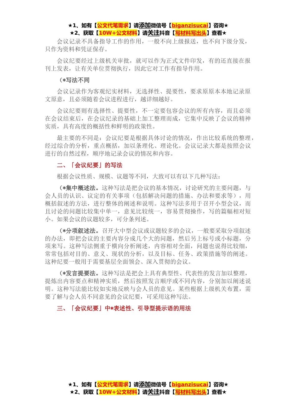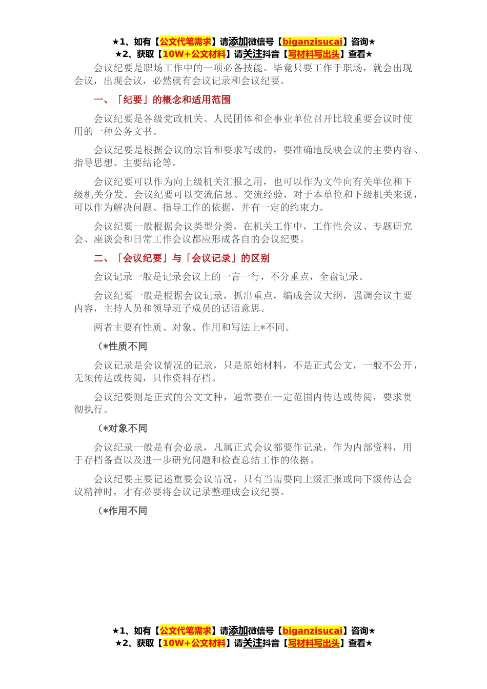 ★1、如有【公文代笔需求】请添加微信号【biganzisucai】咨询★★2、获取【10W+公文材料】请关注抖音【写材料写出头】查看★会议纪要是职场工作中的一项必备技能。毕竟只要工作于职场,就会出现会议,出现会议,必然就有会议记录和会议纪要。一、「纪要」的概念和适用范围会议纪要是各级党政机关、人民团体和企事业单位召开比较重要会议时使用的一种公务文书。会议纪要是根据会议的宗旨和要求写成的,要准确地反映会议的主要内容、指导思想、主要结论等。会议纪要可以作为向上级机关汇报之用,也可以作为文件向有关单位和下级机关分发。会议纪要可以交流信息、交流经验,对于本单位和下级机关来说,可以作为解决问题、指导工作的依据,并有一定的约束力。会议纪要一般根据会议类型分类,在机关工作中,工作性会议...