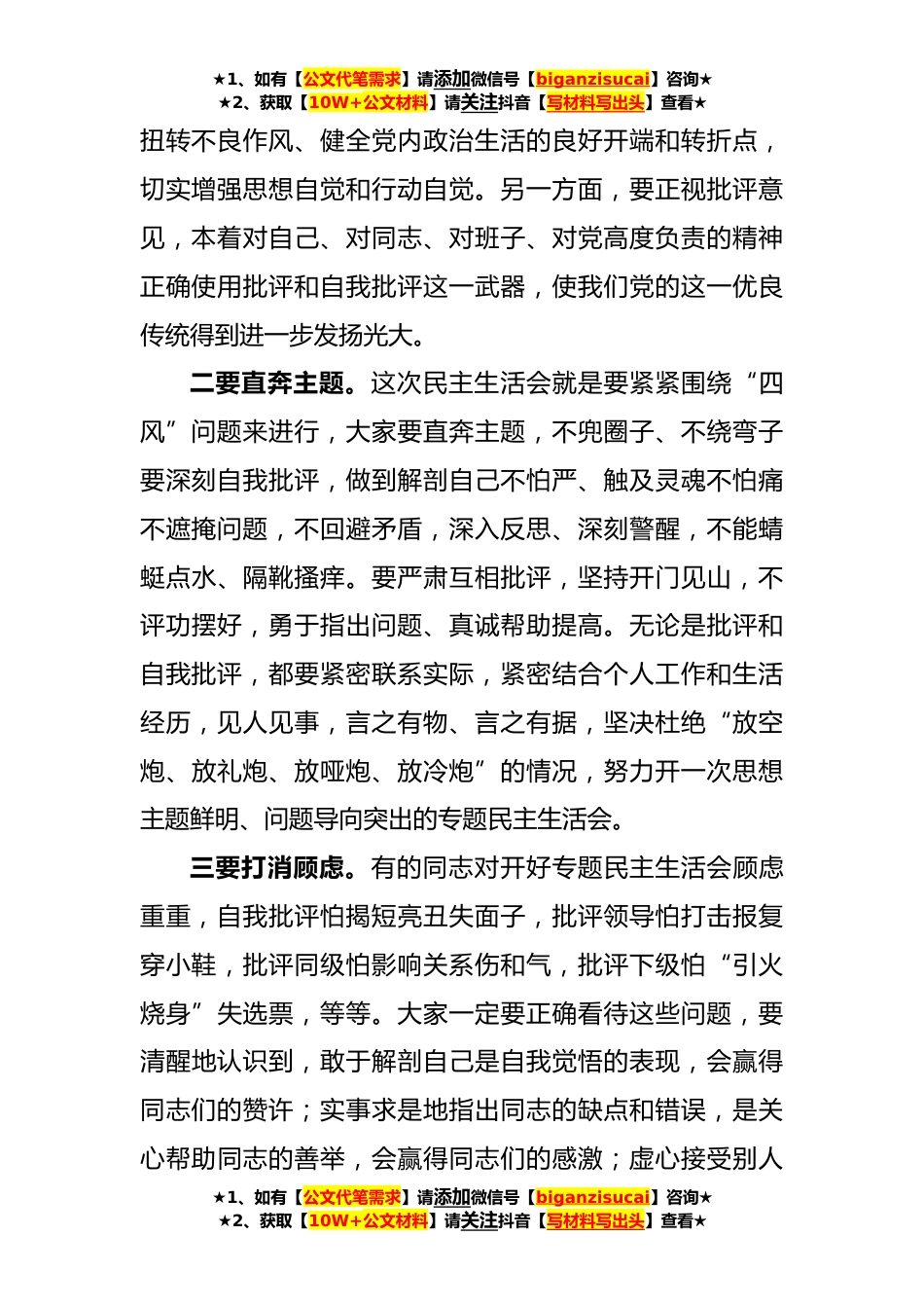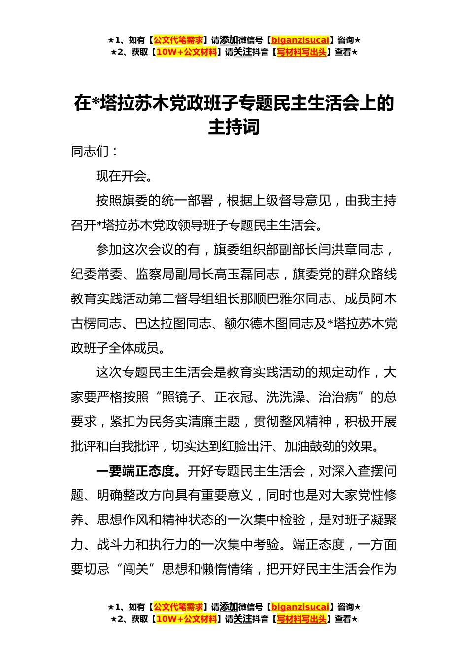 ★1、如有【公文代笔需求】请添加微信号【biganzisucai】咨询★★2、获取【10W+公文材料】请关注抖音【写材料写出头】查看★在*塔拉苏木党政班子专题民主生活会上的主持词同志们:现在开会。按照旗委的统一部署,根据上级督导意见,由我主持召开*塔拉苏木党政领导班子专题民主生活会。参加这次会议的有,旗委组织部副部长闫洪章同志,纪委常委、监察局副局长高玉磊同志,旗委党的群众路线教育实践活动第二督导组组长那顺巴雅尔同志、成员阿木古楞同志、巴达拉图同志、额尔德木图同志及*塔拉苏木党政班子全体成员。这次专题民主生活会是教育实践活动的规定动作,大家要严格按照“照镜子、正衣冠、洗洗澡、治治病”的总要求,紧扣为民务实清廉主题,贯彻整风精神,积极开展批评和自我批评,切实达到红脸出汗、加油鼓...