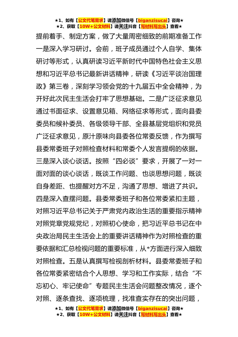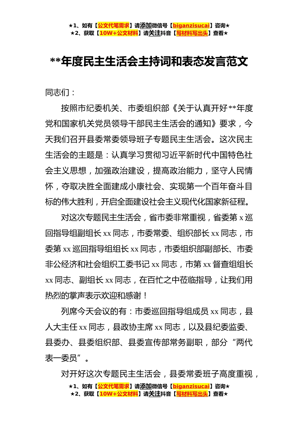 ★1、如有【公文代笔需求】请添加微信号【biganzisucai】咨询★★2、获取【10W+公文材料】请关注抖音【写材料写出头】查看★**年度民主生活会主持词和表态发言范文同志们:按照市纪委机关、市委组织部《关于认真开好**年度党和国家机关党员领导干部民主生活会的通知》要求,今天我们召开县委常委领导班子专题民主生活会。这次民主生活会的主题是:认真学习贯彻习近平新时代中国特色社会主义思想,加强政治建设,提高政治能力,坚守人民情怀,夺取决胜全面建成小康社会、实现第一个百年奋斗目标的伟大胜利,开启全面建设社会主义现代化国家新征程。对这次专题民主生活会,省市委非常重视,省委第x巡回指导组副组长xx同志,市委常委、组织部长xx同志,市委第xx巡回指导组组长xx同志,市委组织部副部长、市委非公经济...