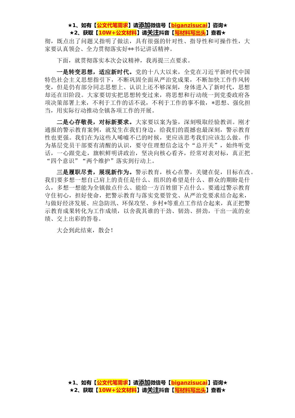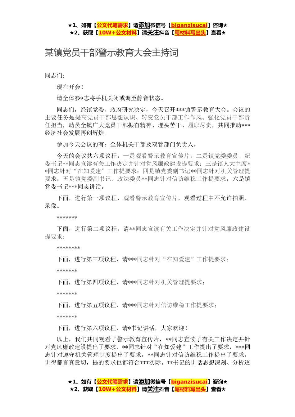 ★1、如有【公文代笔需求】请添加微信号【biganzisucai】咨询★★2、获取【10W+公文材料】请关注抖音【写材料写出头】查看★某镇党员干部警示教育大会主持词同志们:现在开会!请全体参*志将手机关闭或调至静音状态。同志们,经镇党委、政府研究决定,今天召开***镇警示教育大会。会议的主要任务是提高党员干部思想认识、转变党员干部工作作风、强化党员干部责任担当,动员全镇广大党员干部振奋精神、埋头苦干、履职尽责,共同推动***经济社会发展再创辉煌。参加今天会议的有:全体机关干部及双管部门负责人。今天的会议共六项议程:一是观看警示教育宣传片;二是镇党委委员、纪委书记**同志宣读有关工作决定并针对党风廉政建设提要求;三是镇人大主席**同志针对“在知爱建”工作提要求;四是镇党委副书记**同志针...