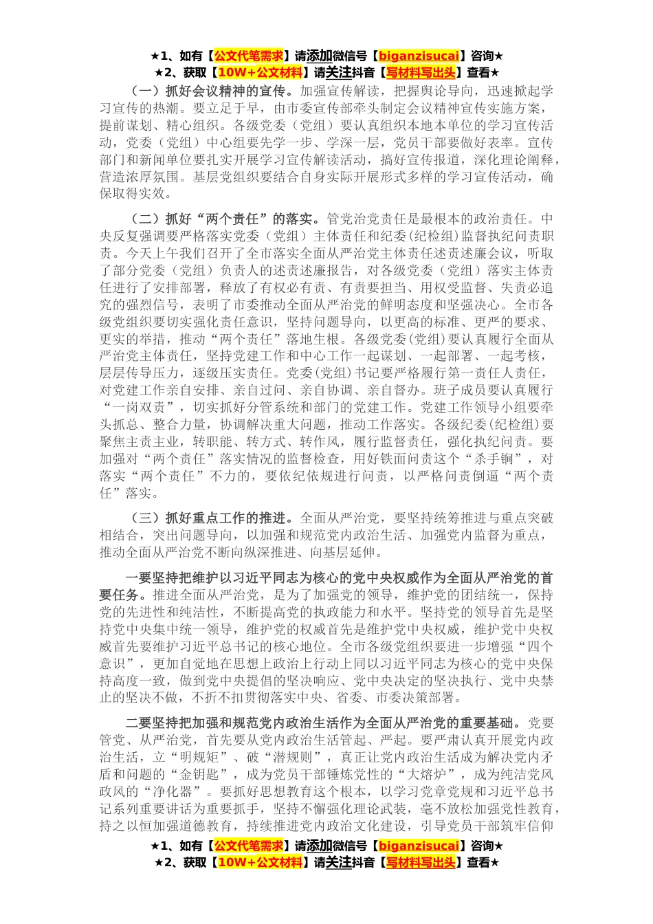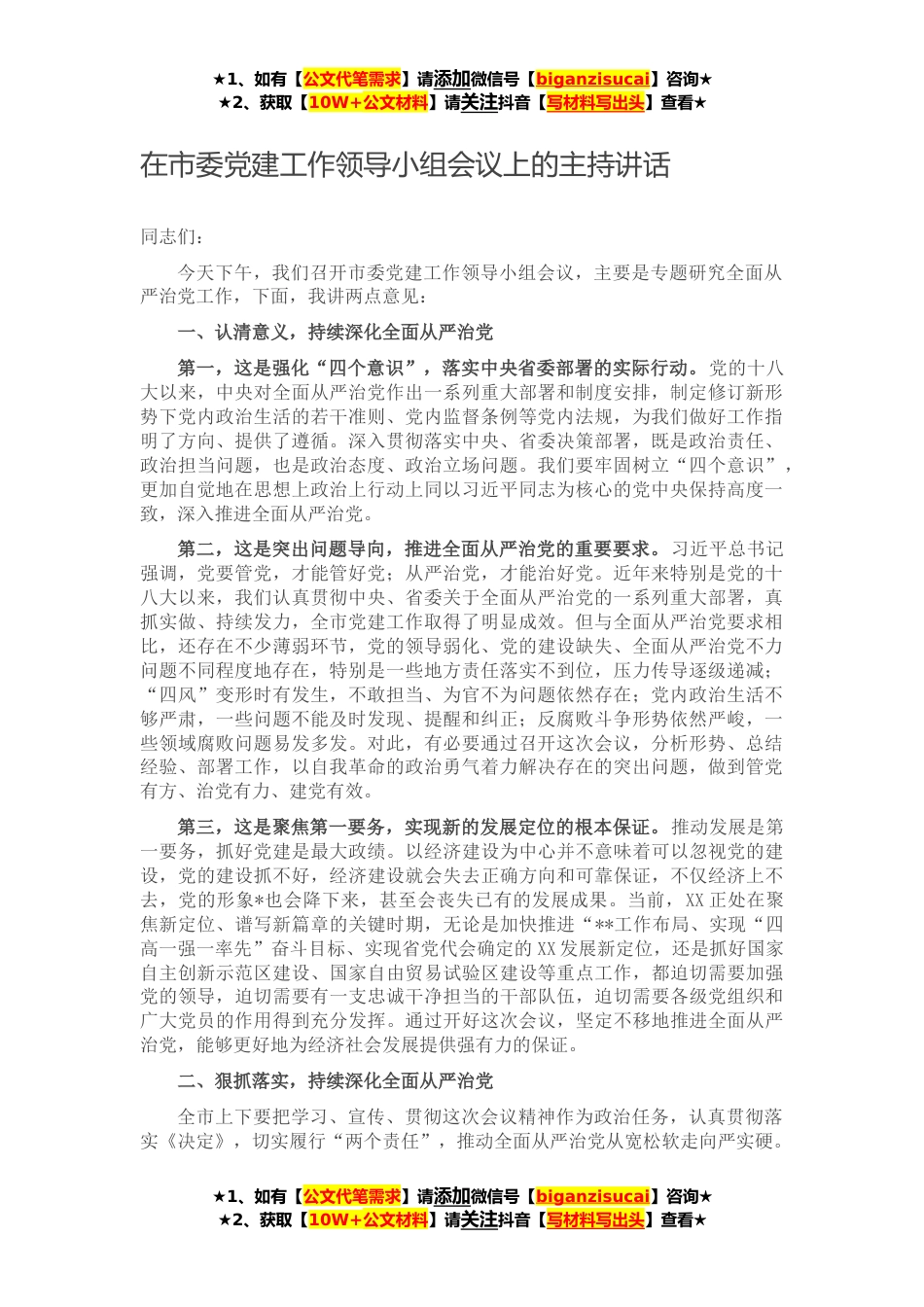 ★1、如有【公文代笔需求】请添加微信号【biganzisucai】咨询★★2、获取【10W+公文材料】请关注抖音【写材料写出头】查看★在市委党建工作领导小组会议上的主持讲话同志们:今天下午,我们召开市委党建工作领导小组会议,主要是专题研究全面从严治党工作,下面,我讲两点意见:一、认清意义,持续深化全面从严治党第一,这是强化“四个意识”,落实中央省委部署的实际行动。党的十八大以来,中央对全面从严治党作出一系列重大部署和制度安排,制定修订新形势下党内政治生活的若干准则、党内监督条例等党内法规,为我们做好工作指明了方向、提供了遵循。深入贯彻落实中央、省委决策部署,既是政治责任、政治担当问题,也是政治态度、政治立场问题。我们要牢固树立“四个意识”,更加自觉地在思想上政治上行动上同...