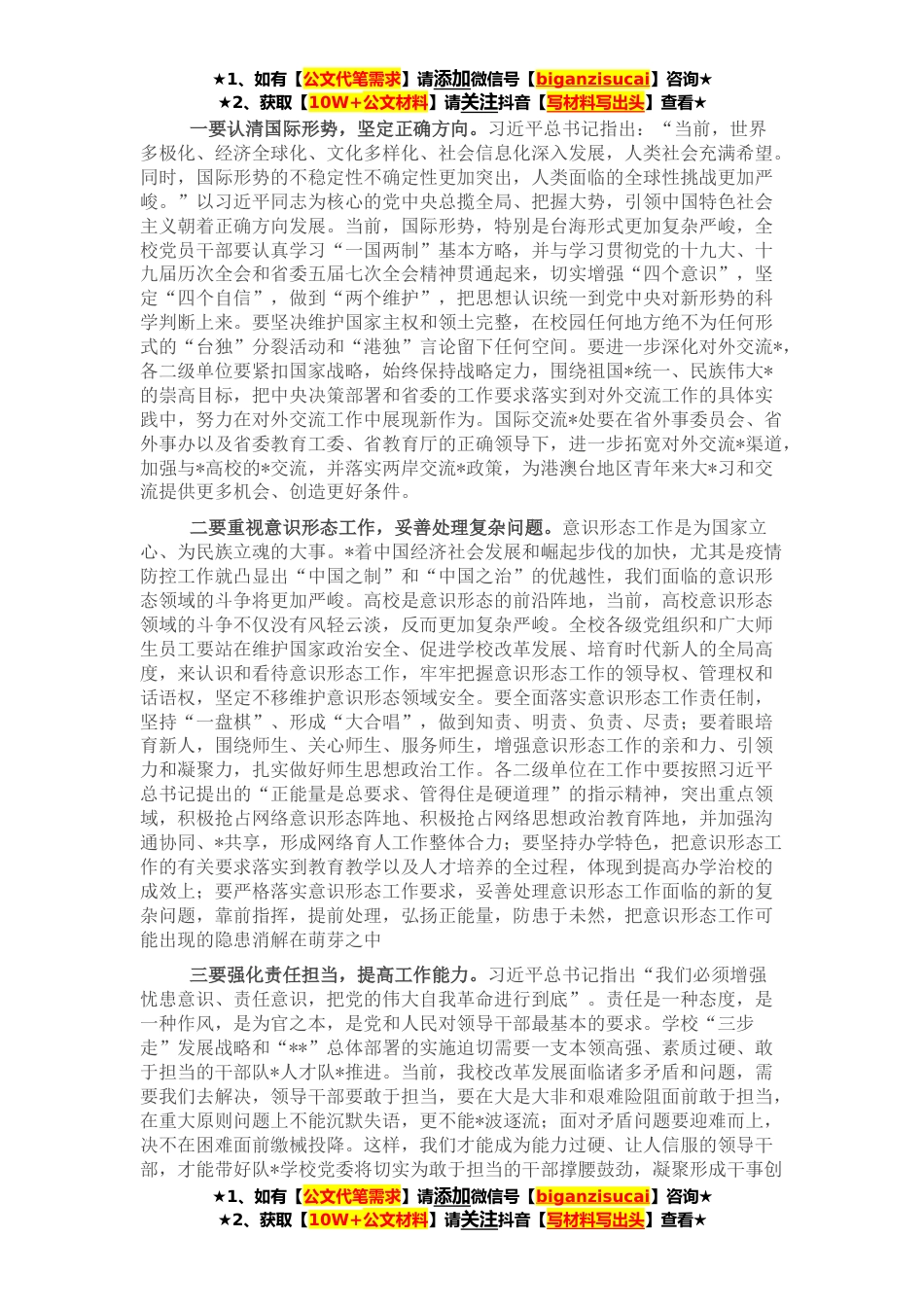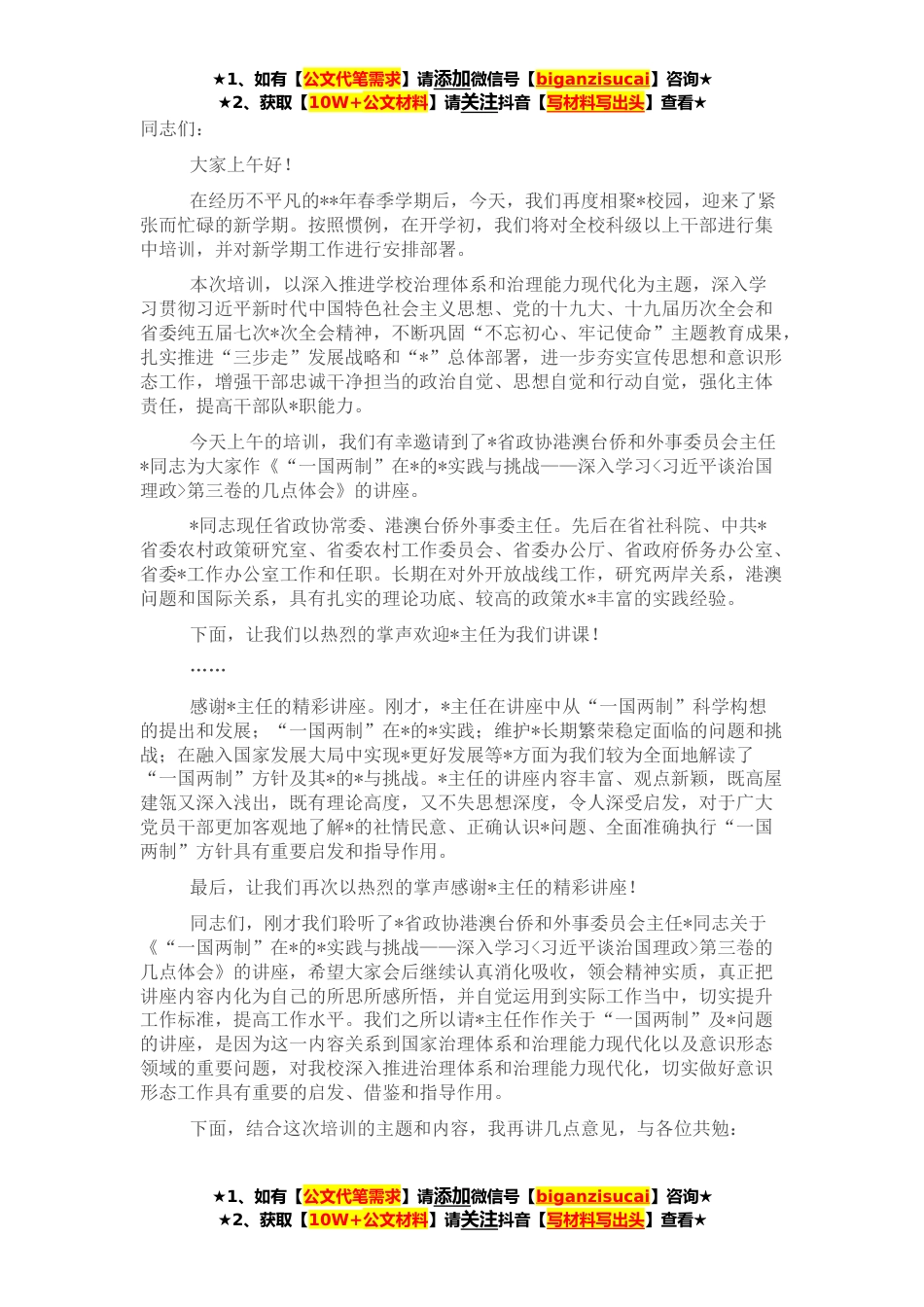 ★1、如有【公文代笔需求】请添加微信号【biganzisucai】咨询★★2、获取【10W+公文材料】请关注抖音【写材料写出头】查看★同志们:大家上午好!在经历不平凡的**年春季学期后,今天,我们再度相聚*校园,迎来了紧张而忙碌的新学期。按照惯例,在开学初,我们将对全校科级以上干部进行集中培训,并对新学期工作进行安排部署。本次培训,以深入推进学校治理体系和治理能力现代化为主题,深入学习贯彻习近平新时代中国特色社会主义思想、党的十九大、十九届历次全会和省委纯五届七次*次全会精神,不断巩固“不忘初心、牢记使命”主题教育成果,扎实推进“三步走”发展战略和“*”总体部署,进一步夯实宣传思想和意识形态工作,增强干部忠诚干净担当的政治自觉、思想自觉和行动自觉,强化主体责任,提高干部队*职能...
