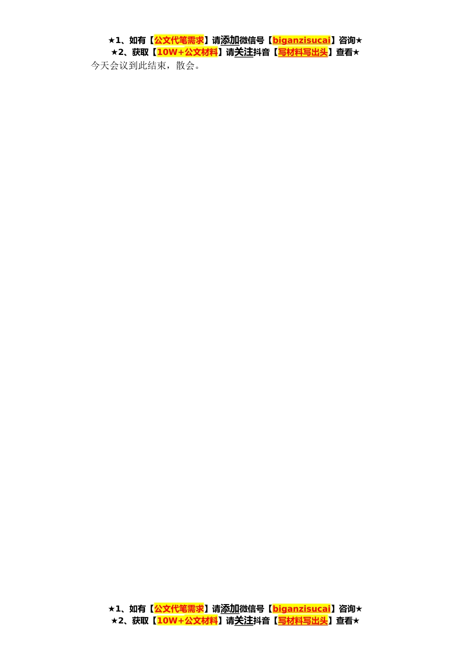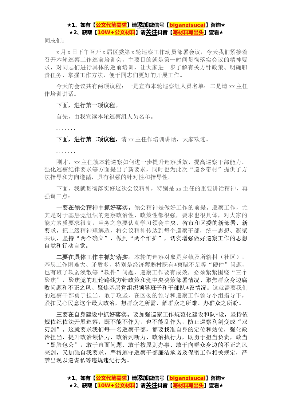 ★1、如有【公文代笔需求】请添加微信号【biganzisucai】咨询★★2、获取【10W+公文材料】请关注抖音【写材料写出头】查看★同志们:x月x日下午召开x届区委第x轮巡察工作动员部署会议,今天我们紧接着召开本轮巡察工作巡前培训会,主要目的就是第一时间贯彻落实会议的精神要求,对同志们进行具体的巡前培训,让大家进一步了解有关方针政策、明确职责任务、掌握工作方法,便于同志们更好的开展工作。今天的会议共有两项议程:一是宣布本轮巡察组人员名单;二是请xx主任作培训讲话。下面,进行第一项议程。首先,由我宣读本轮巡察组人员名单。.......下面,进行第二项议程,请xx主任作培训讲话,大家欢迎。.......刚才,xx主任就本轮巡察如何进一步提升巡察质效、提高巡察干部能力、强化巡察纪律要求等方面提出了新...