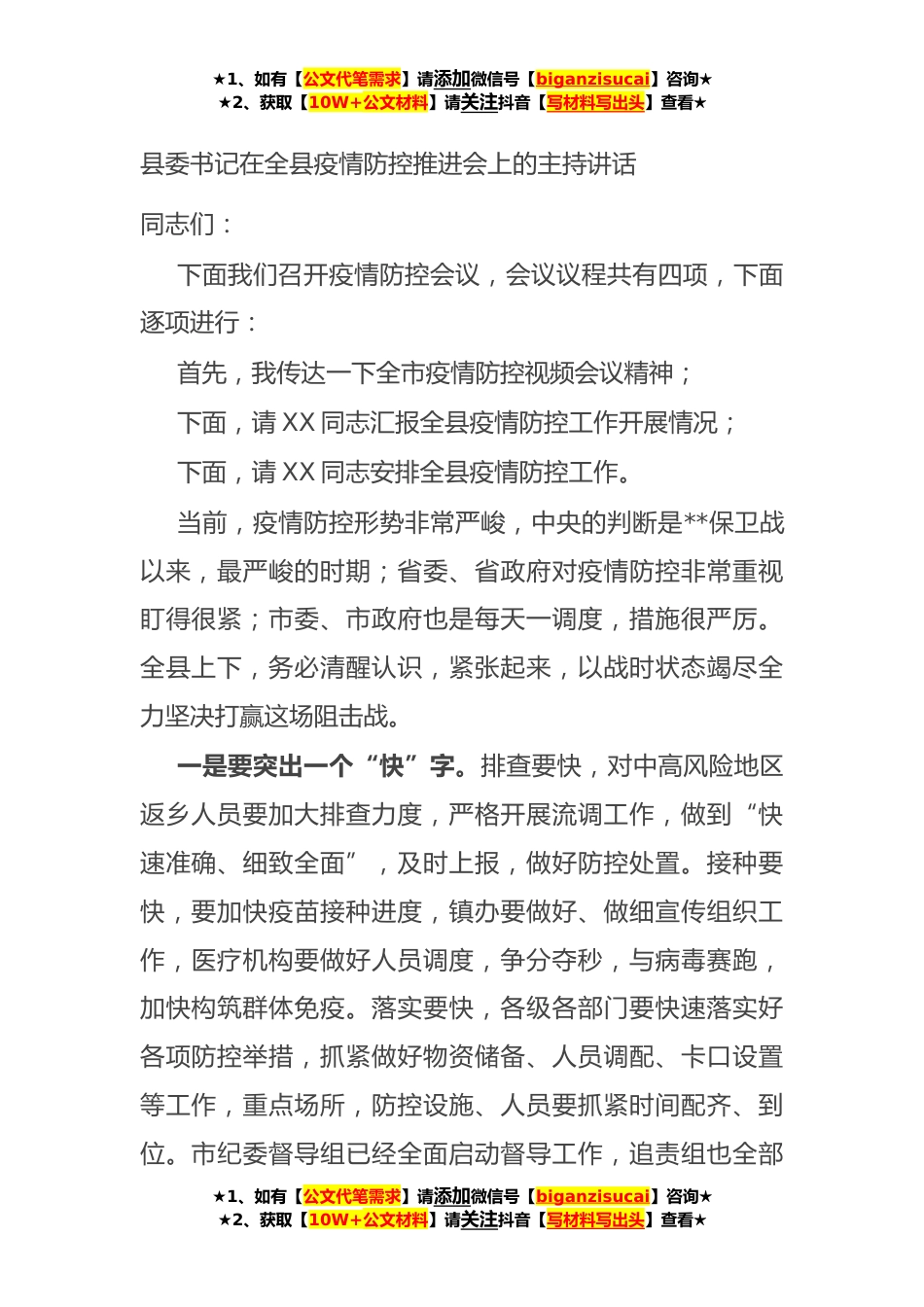★1、如有【公文代笔需求】请添加微信号【biganzisucai】咨询★★2、获取【10W+公文材料】请关注抖音【写材料写出头】查看★县委书记在全县疫情防控推进会上的主持讲话同志们:下面我们召开疫情防控会议,会议议程共有四项,下面逐项进行:首先,我传达一下全市疫情防控视频会议精神;下面,请XX同志汇报全县疫情防控工作开展情况;下面,请XX同志安排全县疫情防控工作。当前,疫情防控形势非常严峻,中央的判断是**保卫战以来,最严峻的时期;省委、省政府对疫情防控非常重视盯得很紧;市委、市政府也是每天一调度,措施很严厉。全县上下,务必清醒认识,紧张起来,以战时状态竭尽全力坚决打赢这场阻击战。一是要突出一个“快”字。排查要快,对中高风险地区返乡人员要加大排查力度,严格开展流调工作,做到“快...