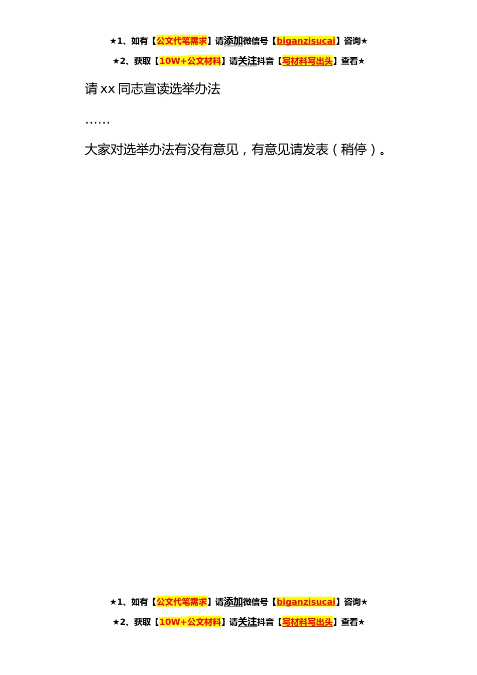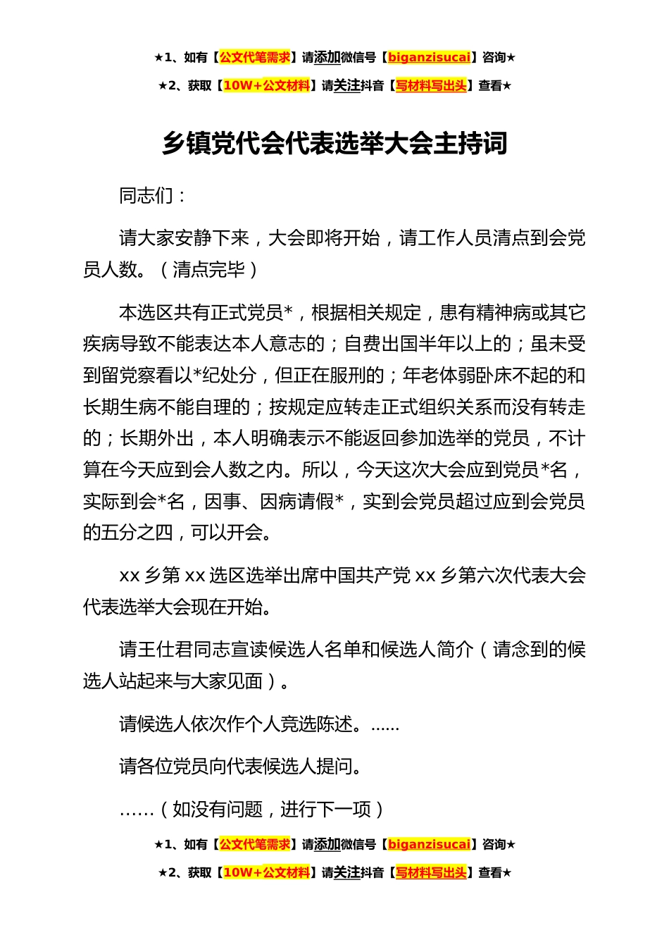 ★1、如有【公文代笔需求】请添加微信号【biganzisucai】咨询★★2、获取【10W+公文材料】请关注抖音【写材料写出头】查看★乡镇党代会代表选举大会主持词同志们:请大家安静下来,大会即将开始,请工作人员清点到会党员人数。(清点完毕)本选区共有正式党员*,根据相关规定,患有精神病或其它疾病导致不能表达本人意志的;自费出国半年以上的;虽未受到留党察看以*纪处分,但正在服刑的;年老体弱卧床不起的和长期生病不能自理的;按规定应转走正式组织关系而没有转走的;长期外出,本人明确表示不能返回参加选举的党员,不计算在今天应到会人数之内。所以,今天这次大会应到党员*名,实际到会*名,因事、因病请假*,实到会党员超过应到会党员的五分之四,可以开会。xx乡第xx选区选举出席中国共产党xx乡第六次代...