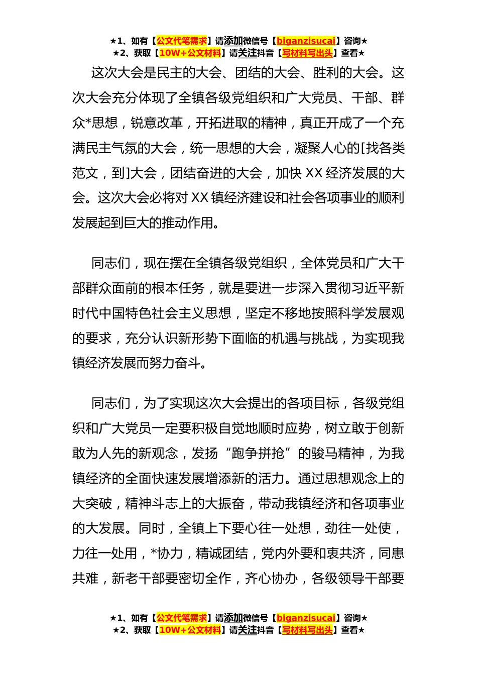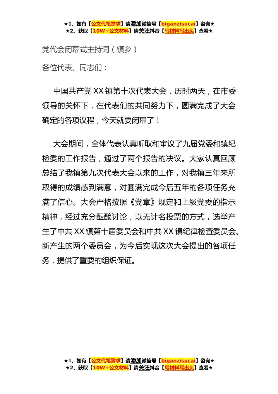 ★1、如有【公文代笔需求】请添加微信号【biganzisucai】咨询★★2、获取【10W+公文材料】请关注抖音【写材料写出头】查看★党代会闭幕式主持词(镇乡)各位代表、同志们:中国共产党XX镇第十次代表大会,历时两天,在市委领导的关怀下,在代表们的共同努力下,圆满完成了大会确定的各项议程,今天就要闭幕了!大会期间,全体代表认真听取和审议了九届党委和镇纪检委的工作报告,通过了两个报告的决议。大家认真回顾总结了我镇第九次代表大会以来的工作,对我镇三年来所取得的成绩感到满意,对圆满完成今后五年的各项任务充满了信心。大会严格按照《党章》规定和上级党委的指示精神,经过充分酝酿讨论,以无计名投票的方式,选举产生了中共XX镇第十届委员会和中共XX镇纪律检查委员会。新产生的两个委员会,为今后...