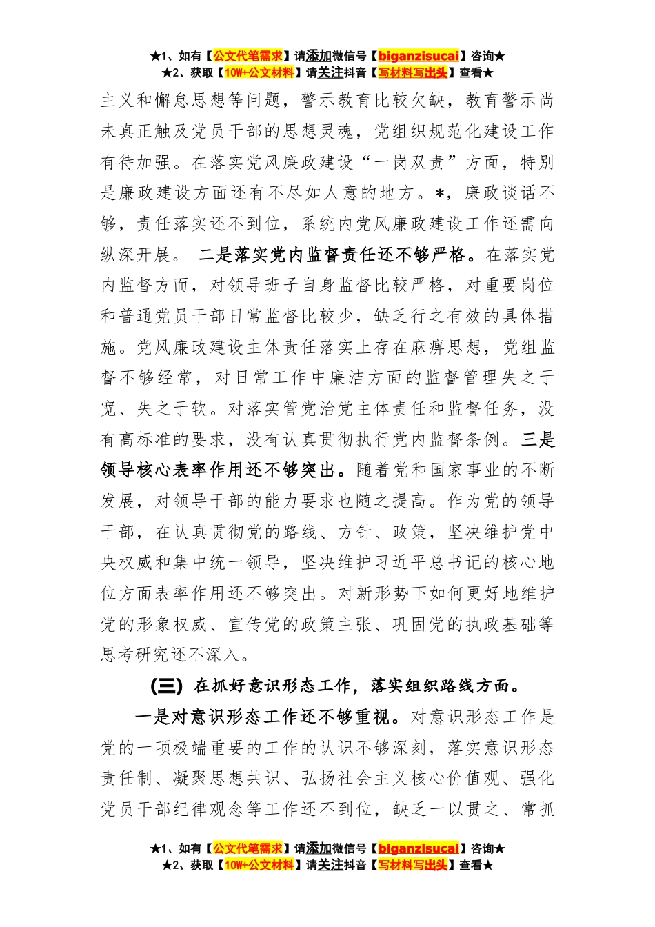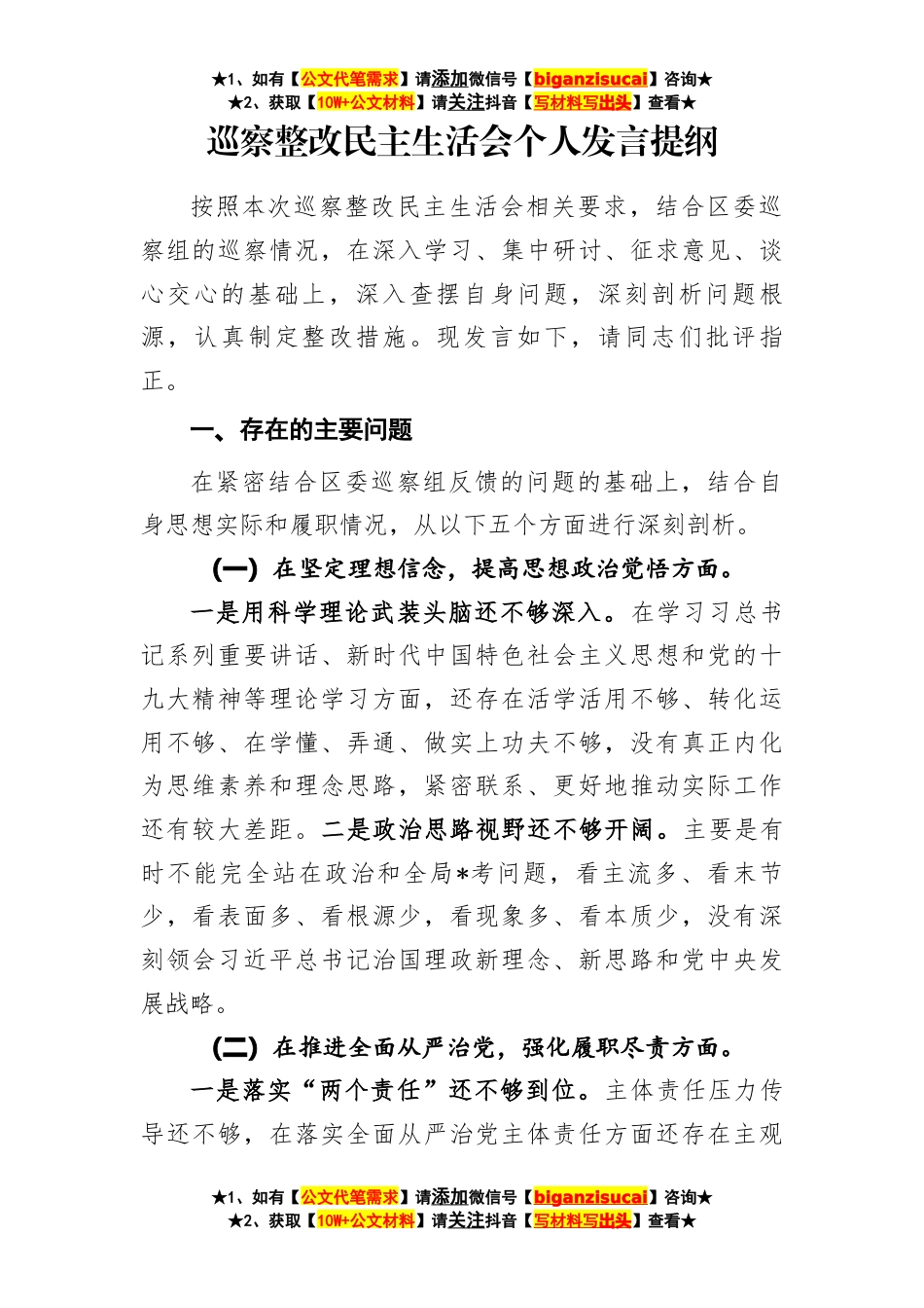 ★1、如有【公文代笔需求】请添加微信号【biganzisucai】咨询★★2、获取【10W+公文材料】请关注抖音【写材料写出头】查看★巡察整改民主生活会个人发言提纲按照本次巡察整改民主生活会相关要求,结合区委巡察组的巡察情况,在深入学习、集中研讨、征求意见、谈心交心的基础上,深入查摆自身问题,深刻剖析问题根源,认真制定整改措施。现发言如下,请同志们批评指正。一、存在的主要问题在紧密结合区委巡察组反馈的问题的基础上,结合自身思想实际和履职情况,从以下五个方面进行深刻剖析。(一)在坚定理想信念,提高思想政治觉悟方面。一是用科学理论武装头脑还不够深入。在学习习总书记系列重要讲话、新时代中国特色社会主义思想和党的十九大精神等理论学习方面,还存在活学活用不够、转化运用不够、在学懂、...