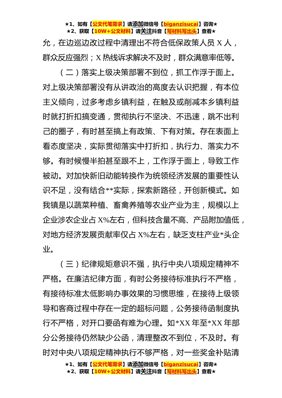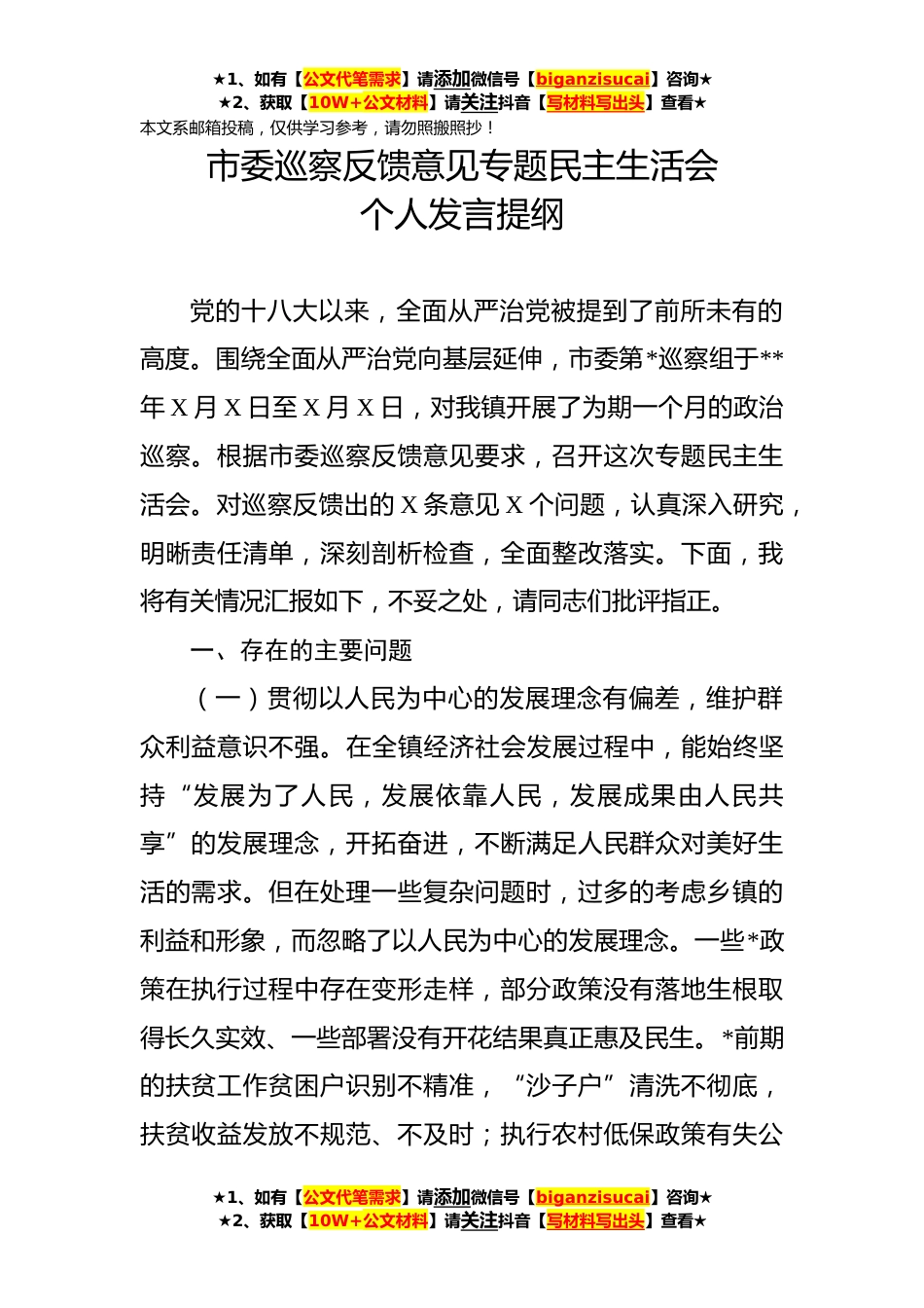★1、如有【公文代笔需求】请添加微信号【biganzisucai】咨询★★2、获取【10W+公文材料】请关注抖音【写材料写出头】查看★本文系邮箱投稿,仅供学习参考,请勿照搬照抄!市委巡察反馈意见专题民主生活会个人发言提纲党的十八大以来,全面从严治党被提到了前所未有的高度。围绕全面从严治党向基层延伸,市委第*巡察组于**年X月X日至X月X日,对我镇开展了为期一个月的政治巡察。根据市委巡察反馈意见要求,召开这次专题民主生活会。对巡察反馈出的X条意见X个问题,认真深入研究,明晰责任清单,深刻剖析检查,全面整改落实。下面,我将有关情况汇报如下,不妥之处,请同志们批评指正。一、存在的主要问题(一)贯彻以人民为中心的发展理念有偏差,维护群众利益意识不强。在全镇经济社会发展过程中,能始终坚持“发...