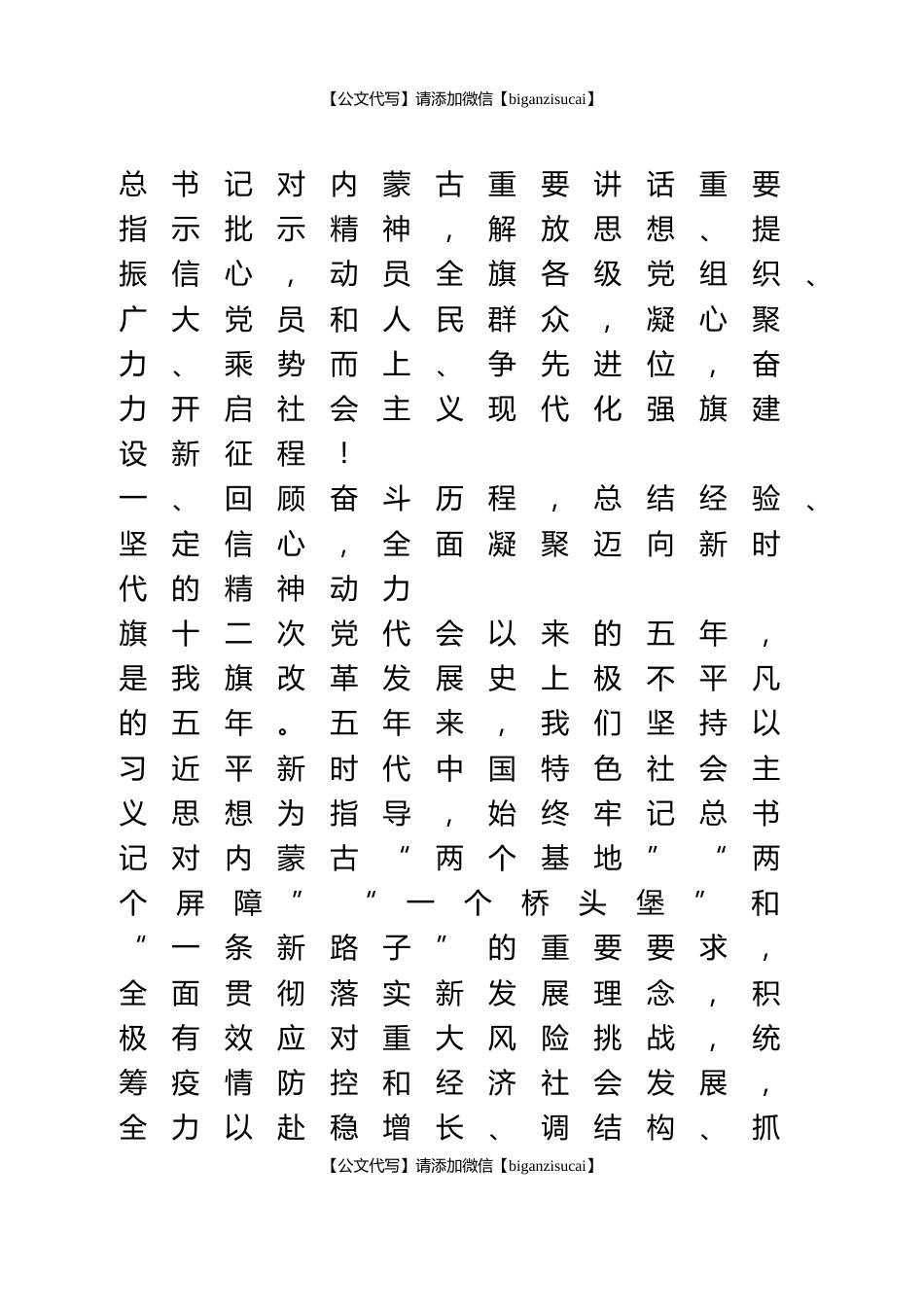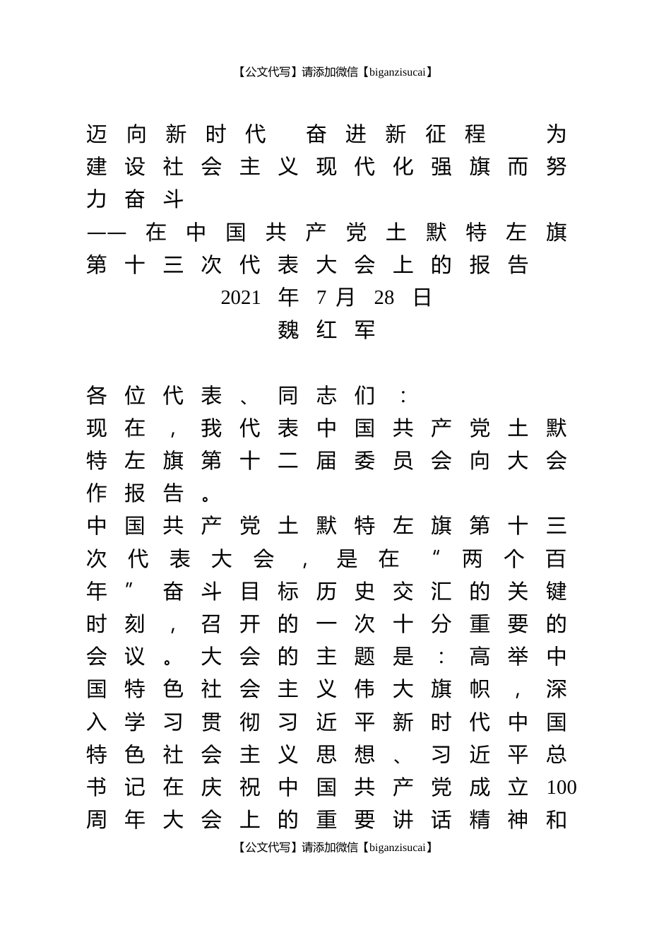 【公文代写】请添加微信【biganzisucai】迈向新时代奋进新征程为建设社会主义现代化强旗而努力奋斗——在中国共产党土默特左旗第十三次代表大会上的报告2021年7月28日魏红军各位代表、同志们:现在,我代表中国共产党土默特左旗第十二届委员会向大会作报告。中国共产党土默特左旗第十三次代表大会,是在“两个百年”奋斗目标历史交汇的关键时刻,召开的一次十分重要的会议。大会的主题是:高举中国特色社会主义伟大旗帜,深入学习贯彻习近平新时代中国特色社会主义思想、习近平总书记在庆祝中国共产党成立100周年大会上的重要讲话精神和【公文代写】请添加微信【biganzisucai】【公文代写】请添加微信【biganzisucai】总书记对内蒙古重要讲话重要指示批示精神,解放思想、提振信心,动员全旗各级党组织、广大党员...