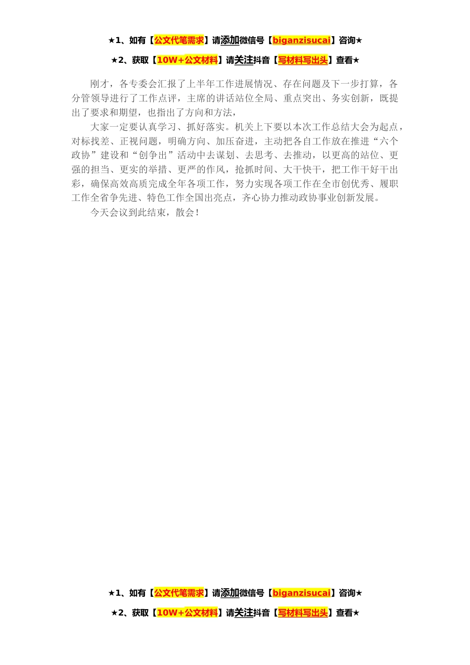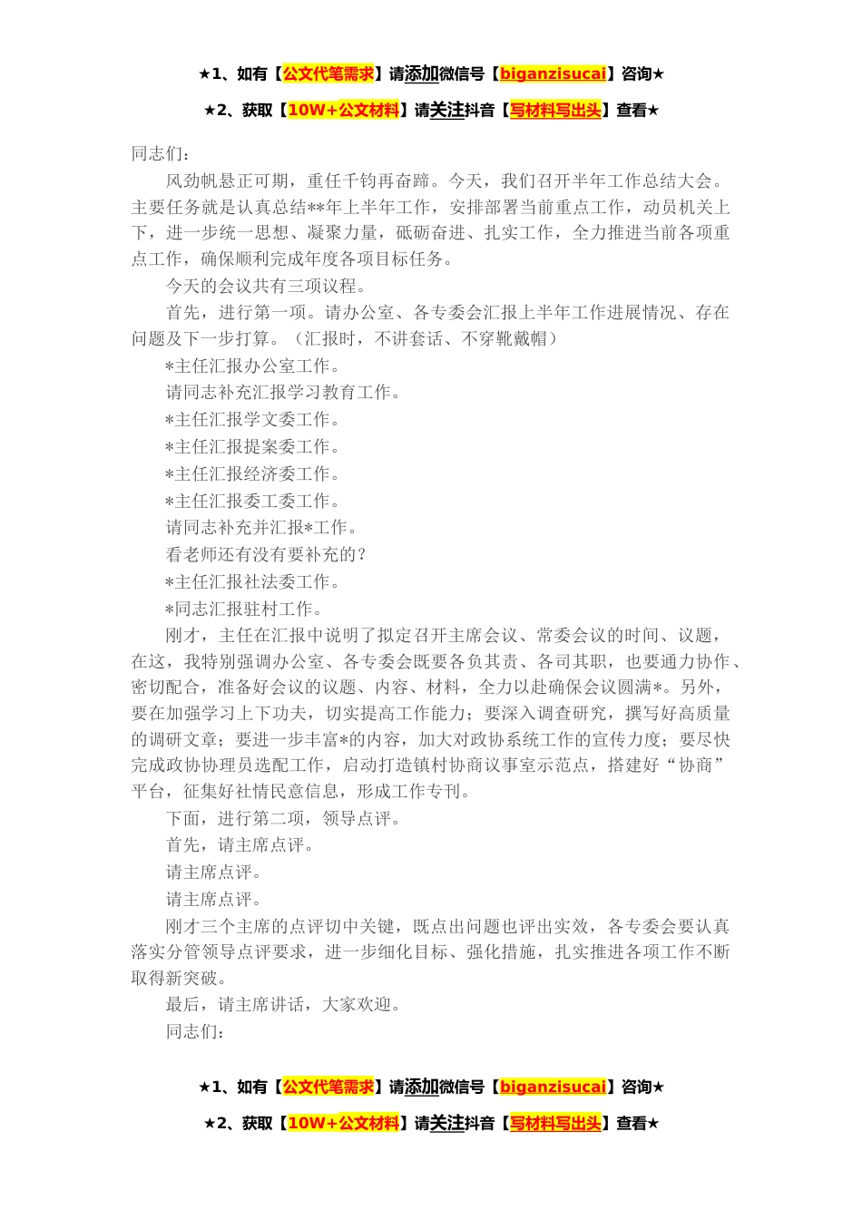★1、如有【公文代笔需求】请添加微信号【biganzisucai】咨询★★2、获取【10W+公文材料】请关注抖音【写材料写出头】查看★同志们:风劲帆悬正可期,重任千钧再奋蹄。今天,我们召开半年工作总结大会。主要任务就是认真总结**年上半年工作,安排部署当前重点工作,动员机关上下,进一步统一思想、凝聚力量,砥砺奋进、扎实工作,全力推进当前各项重点工作,确保顺利完成年度各项目标任务。今天的会议共有三项议程。首先,进行第一项。请办公室、各专委会汇报上半年工作进展情况、存在问题及下一步打算。(汇报时,不讲套话、不穿靴戴帽)*主任汇报办公室工作。请同志补充汇报学习教育工作。*主任汇报学文委工作。*主任汇报提案委工作。*主任汇报经济委工作。*主任汇报委工委工作。请同志补充并汇报*工作。看老师...