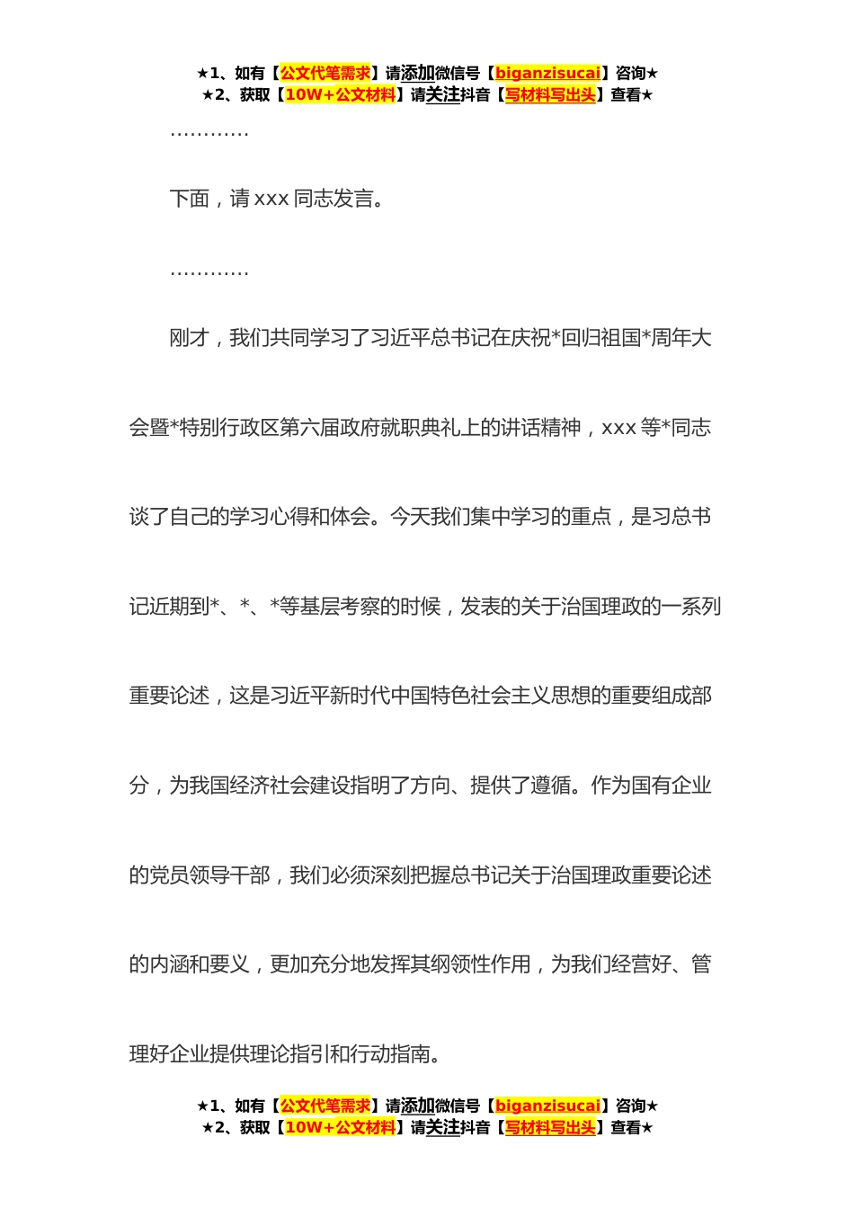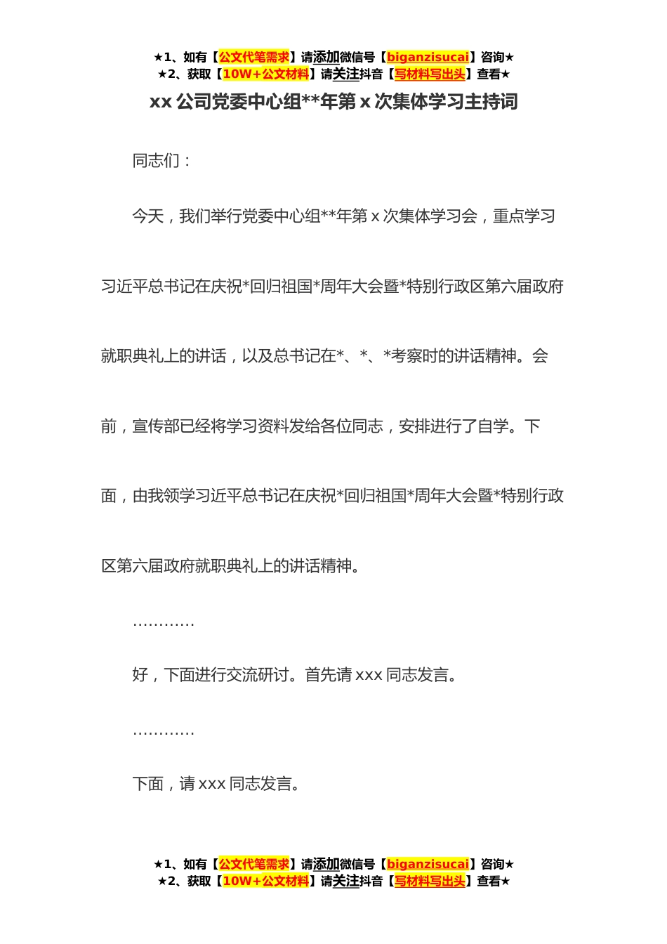 ★1、如有【公文代笔需求】请添加微信号【biganzisucai】咨询★★2、获取【10W+公文材料】请关注抖音【写材料写出头】查看★xx公司党委中心组**年第x次集体学习主持词同志们:今天,我们举行党委中心组**年第x次集体学习会,重点学习习近平总书记在庆祝*回归祖国*周年大会暨*特别行政区第六届政府就职典礼上的讲话,以及总书记在*、*、*考察时的讲话精神。会前,宣传部已经将学习资料发给各位同志,安排进行了自学。下面,由我领学习近平总书记在庆祝*回归祖国*周年大会暨*特别行政区第六届政府就职典礼上的讲话精神。…………好,下面进行交流研讨。首先请xxx同志发言。…………下面,请xxx同志发言。★1、如有【公文代笔需求】请添加微信号【biganzisucai】咨询★★2、获取【10W+公文材料】请关注抖音【写材料写...