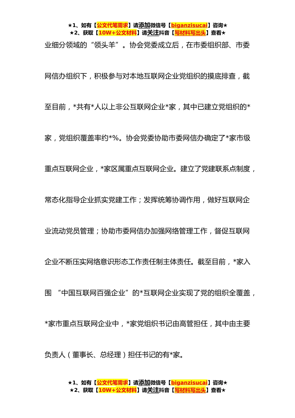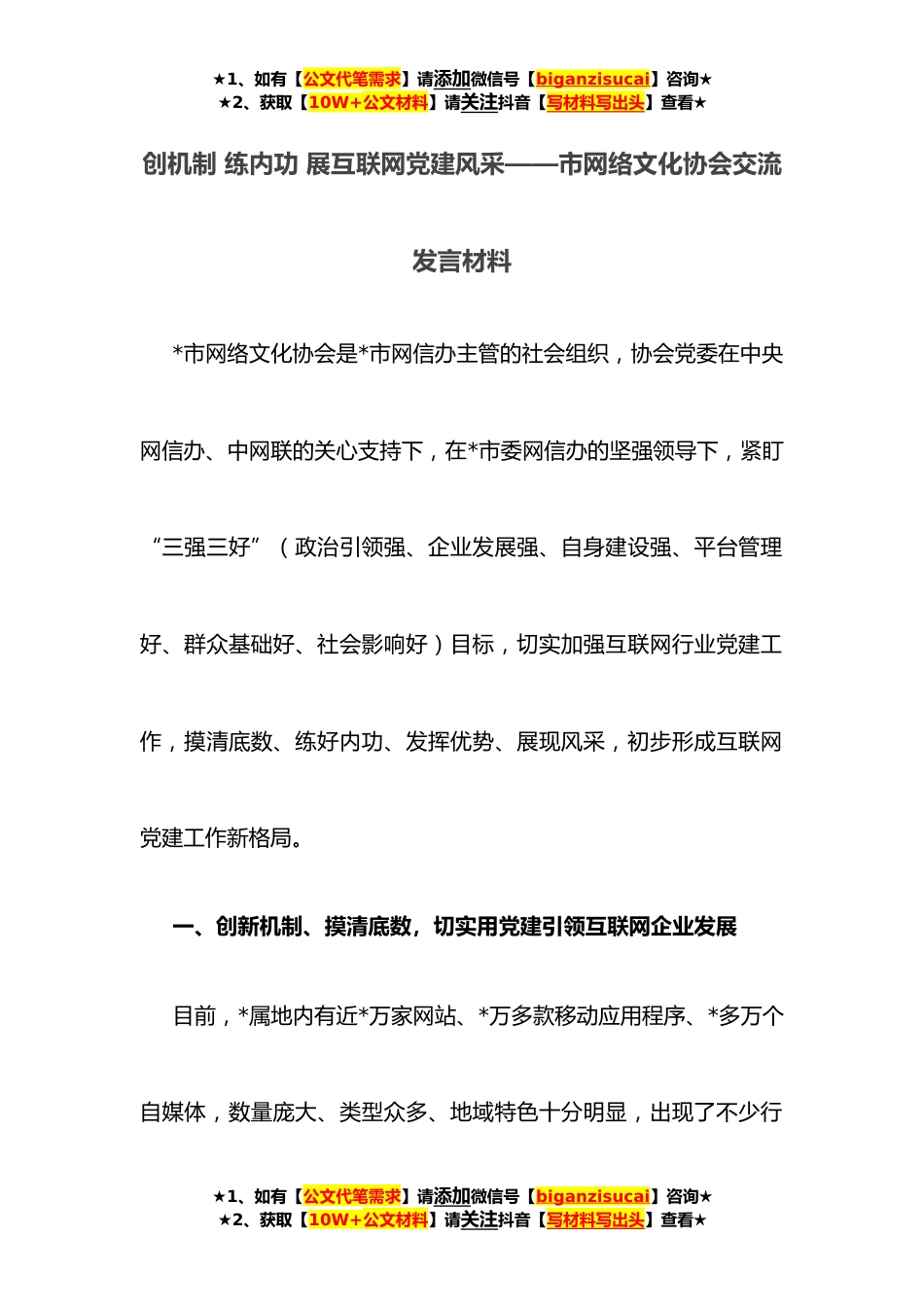 ★1、如有【公文代笔需求】请添加微信号【biganzisucai】咨询★★2、获取【10W+公文材料】请关注抖音【写材料写出头】查看★创机制练内功展互联网党建风采——市网络文化协会交流发言材料*市网络文化协会是*市网信办主管的社会组织,协会党委在中央网信办、中网联的关心支持下,在*市委网信办的坚强领导下,紧盯“三强三好”(政治引领强、企业发展强、自身建设强、平台管理好、群众基础好、社会影响好)目标,切实加强互联网行业党建工作,摸清底数、练好内功、发挥优势、展现风采,初步形成互联网党建工作新格局。一、创新机制、摸清底数,切实用党建引领互联网企业发展目前,*属地内有近*万家网站、*万多款移动应用程序、*多万个自媒体,数量庞大、类型众多、地域特色十分明显,出现了不少行★1、如有【公文代...