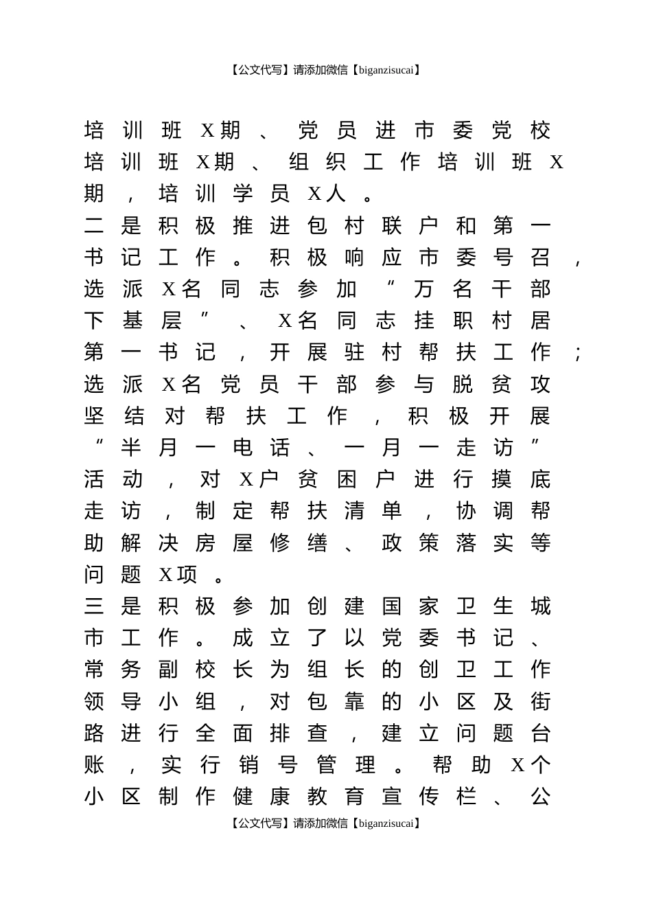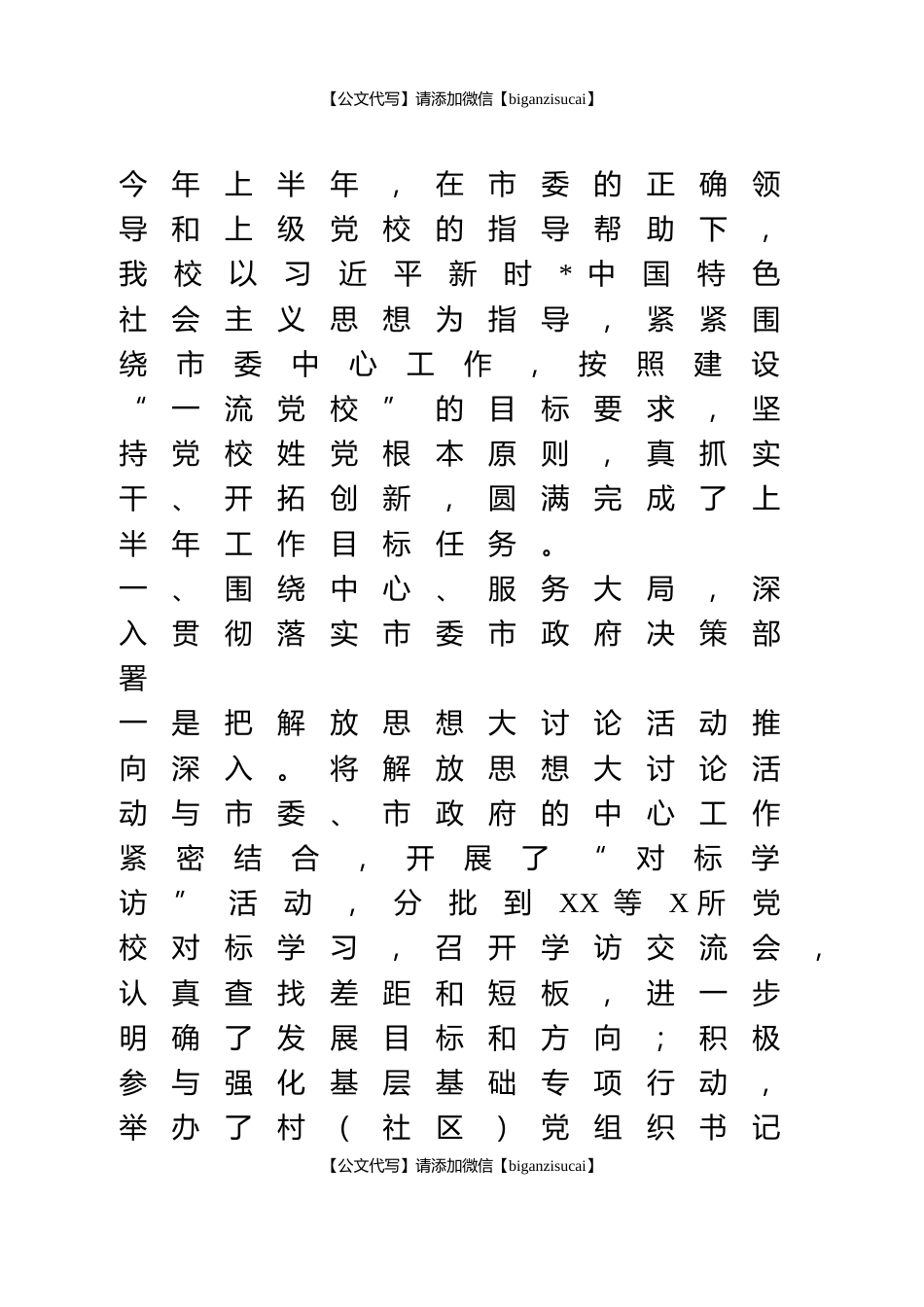 【公文代写】请添加微信【biganzisucai】今年上半年,在市委的正确领导和上级党校的指导帮助下,我校以习近平新时*中国特色社会主义思想为指导,紧紧围绕市委中心工作,按照建设“一流党校”的目标要求,坚持党校姓党根本原则,真抓实干、开拓创新,圆满完成了上半年工作目标任务。一、围绕中心、服务大局,深入贯彻落实市委市政府决策部署一是把解放思想大讨论活动推向深入。将解放思想大讨论活动与市委、市政府的中心工作紧密结合,开展了“对标学访”活动,分批到XX等X所党校对标学习,召开学访交流会,认真查找差距和短板,进一步明确了发展目标和方向;积极参与强化基层基础专项行动,举办了村(社区)党组织书记【公文代写】请添加微信【biganzisucai】【公文代写】请添加微信【biganzisucai】培训班X期、党...