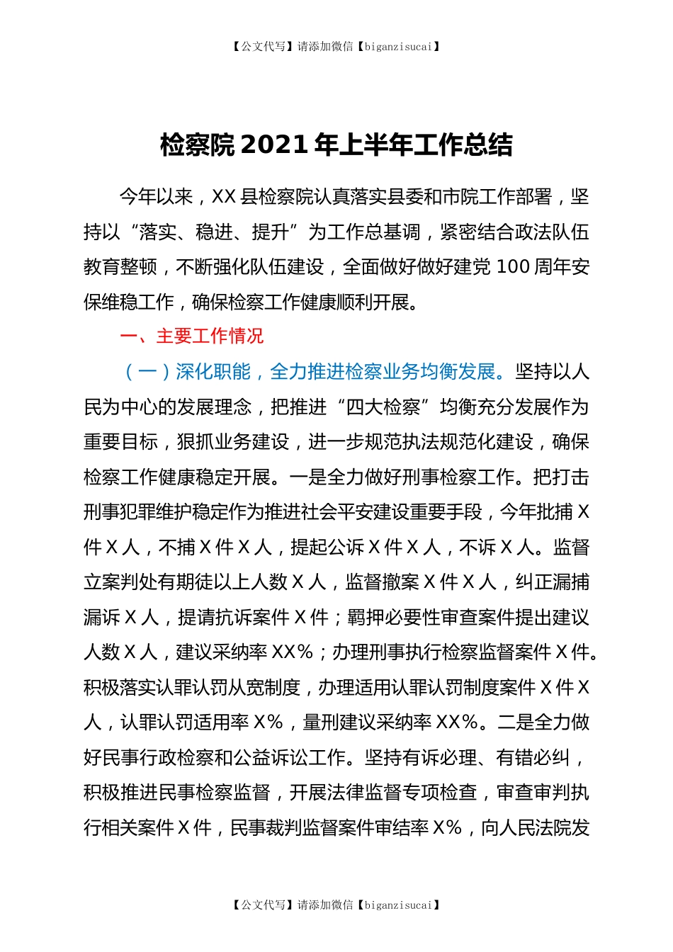 【公文代写】请添加微信【biganzisucai】检察院2021年上半年工作总结今年以来,XX县检察院认真落实县委和市院工作部署,坚持以“落实、稳进、提升”为工作总基调,紧密结合政法队伍教育整顿,不断强化队伍建设,全面做好做好建党100周年安保维稳工作,确保检察工作健康顺利开展。一、主要工作情况(一)深化职能,全力推进检察业务均衡发展。坚持以人民为中心的发展理念,把推进“四大检察”均衡充分发展作为重要目标,狠抓业务建设,进一步规范执法规范化建设,确保检察工作健康稳定开展。一是全力做好刑事检察工作。把打击刑事犯罪维护稳定作为推进社会平安建设重要手段,今年批捕X件X人,不捕X件X人,提起公诉X件X人,不诉X人。监督立案判处有期徒以上人数X人,监督撤案X件X人,纠正漏捕漏诉X人,提请抗诉案件X...