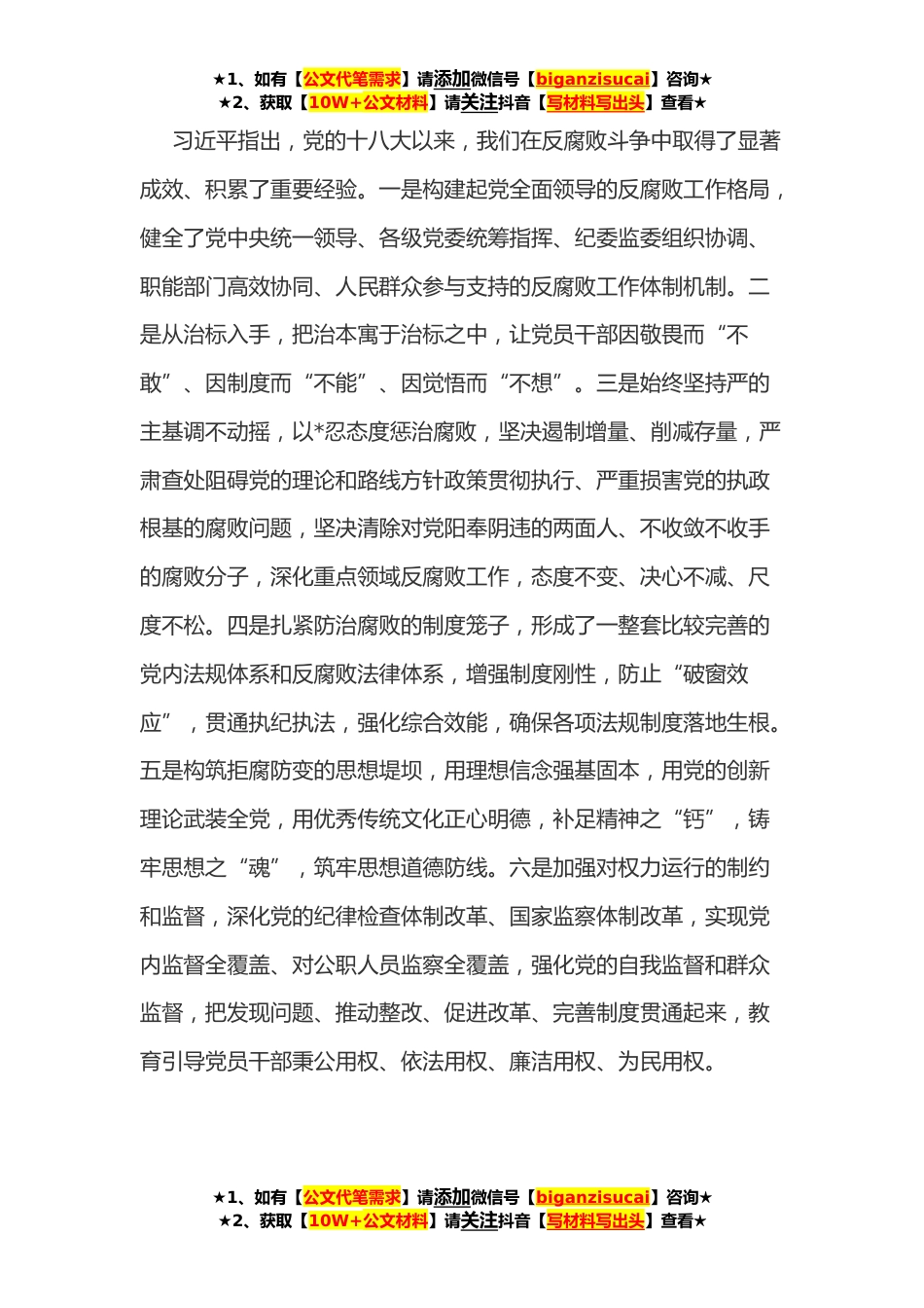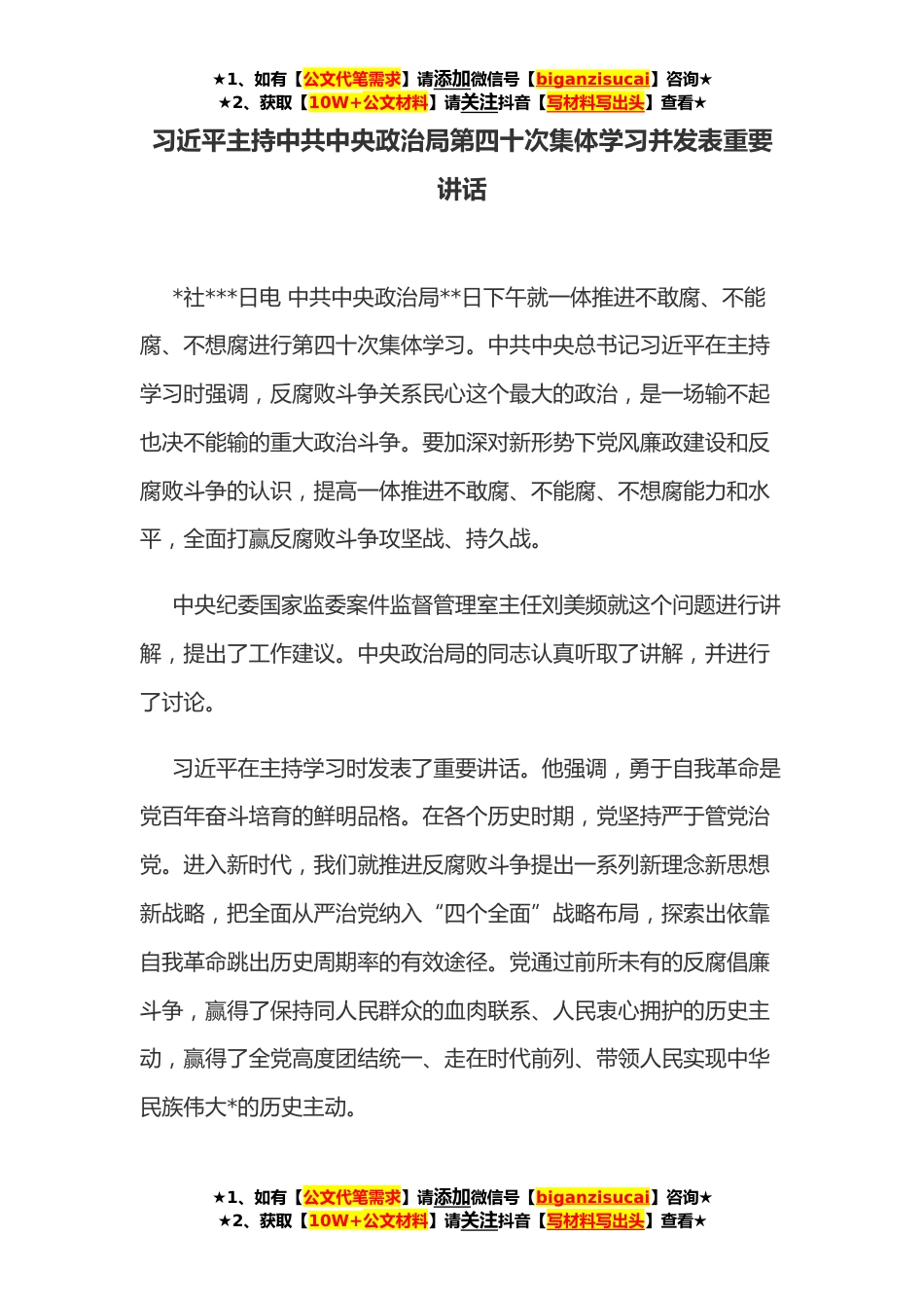 ★1、如有【公文代笔需求】请添加微信号【biganzisucai】咨询★★2、获取【10W+公文材料】请关注抖音【写材料写出头】查看★习近平主持中共中央政治局第四十次集体学习并发表重要讲话*社***日电中共中央政治局**日下午就一体推进不敢腐、不能腐、不想腐进行第四十次集体学习。中共中央总书记习近平在主持学习时强调,反腐败斗争关系民心这个最大的政治,是一场输不起也决不能输的重大政治斗争。要加深对新形势下党风廉政建设和反腐败斗争的认识,提高一体推进不敢腐、不能腐、不想腐能力和水平,全面打赢反腐败斗争攻坚战、持久战。中央纪委国家监委案件监督管理室主任刘美频就这个问题进行讲解,提出了工作建议。中央政治局的同志认真听取了讲解,并进行了讨论。习近平在主持学习时发表了重要讲话。他强调,勇于...