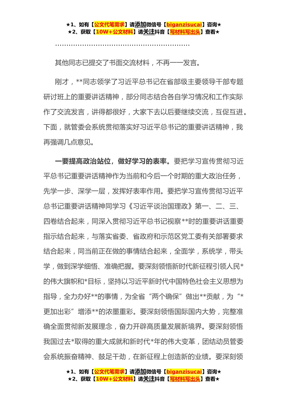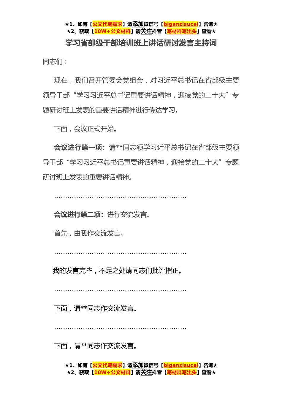 ★1、如有【公文代笔需求】请添加微信号【biganzisucai】咨询★★2、获取【10W+公文材料】请关注抖音【写材料写出头】查看★学习省部级干部培训班上讲话研讨发言主持词同志们:现在,我们召开管委会党组会,对习近平总书记在省部级主要领导干部“学习习近平总书记重要讲话精神,迎接党的二十大”专题研讨班上发表的重要讲话精神进行传达学习。下面,会议正式开始。会议进行第一项:请**同志领学习近平总书记在省部级主要领导干部“学习习近平总书记重要讲话精神,迎接党的二十大”专题研讨班上发表的重要讲话精神。……………………………………………………会议进行第二项:进行交流发言。首先,由我作交流发言。……………………………………………………我的发言完毕,不足之处请同志们批评指正。………………...