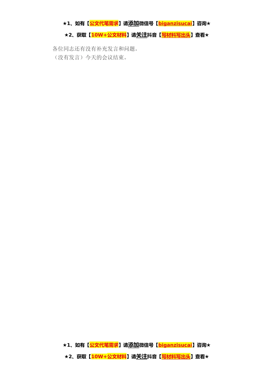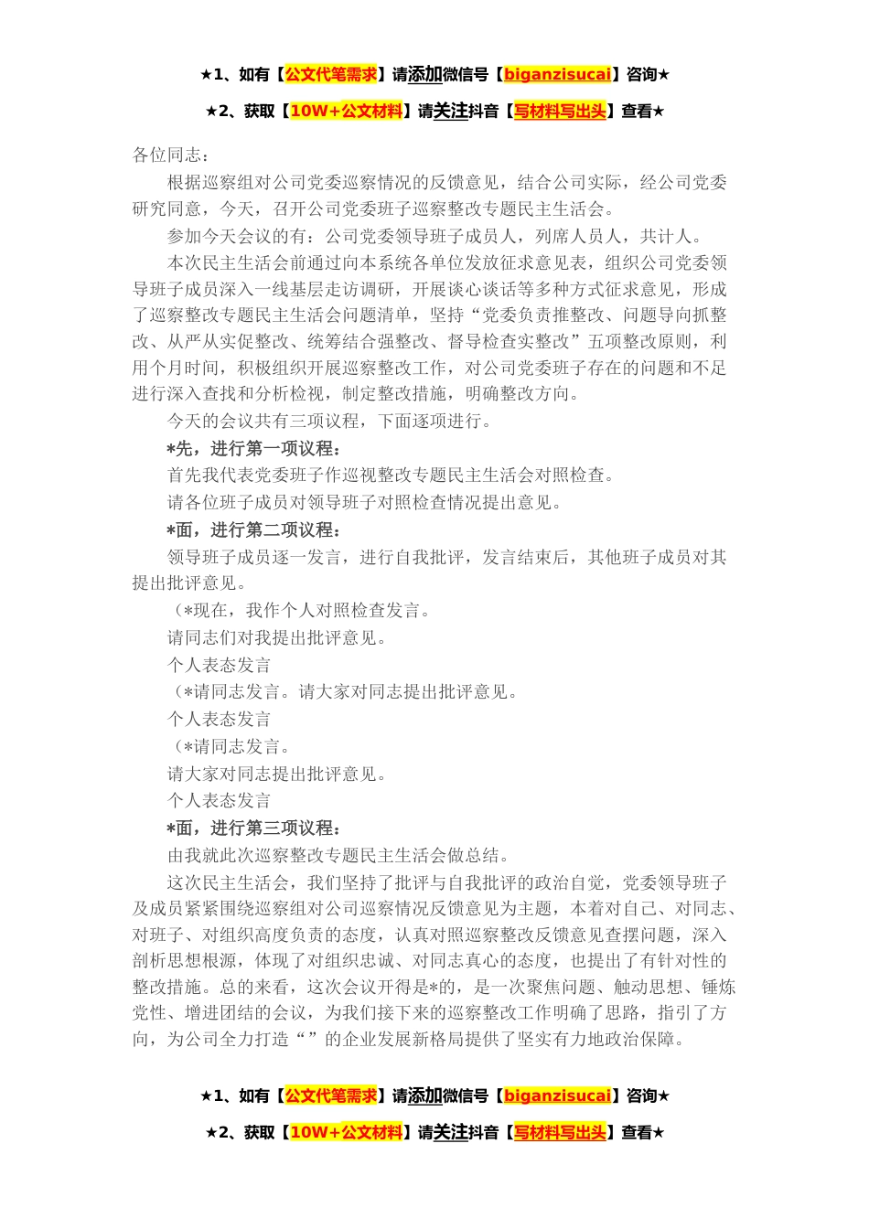 ★1、如有【公文代笔需求】请添加微信号【biganzisucai】咨询★★2、获取【10W+公文材料】请关注抖音【写材料写出头】查看★各位同志:根据巡察组对公司党委巡察情况的反馈意见,结合公司实际,经公司党委研究同意,今天,召开公司党委班子巡察整改专题民主生活会。参加今天会议的有:公司党委领导班子成员人,列席人员人,共计人。本次民主生活会前通过向本系统各单位发放征求意见表,组织公司党委领导班子成员深入一线基层走访调研,开展谈心谈话等多种方式征求意见,形成了巡察整改专题民主生活会问题清单,坚持“党委负责推整改、问题导向抓整改、从严从实促整改、统筹结合强整改、督导检查实整改”五项整改原则,利用个月时间,积极组织开展巡察整改工作,对公司党委班子存在的问题和不足进行深入查找和分析...